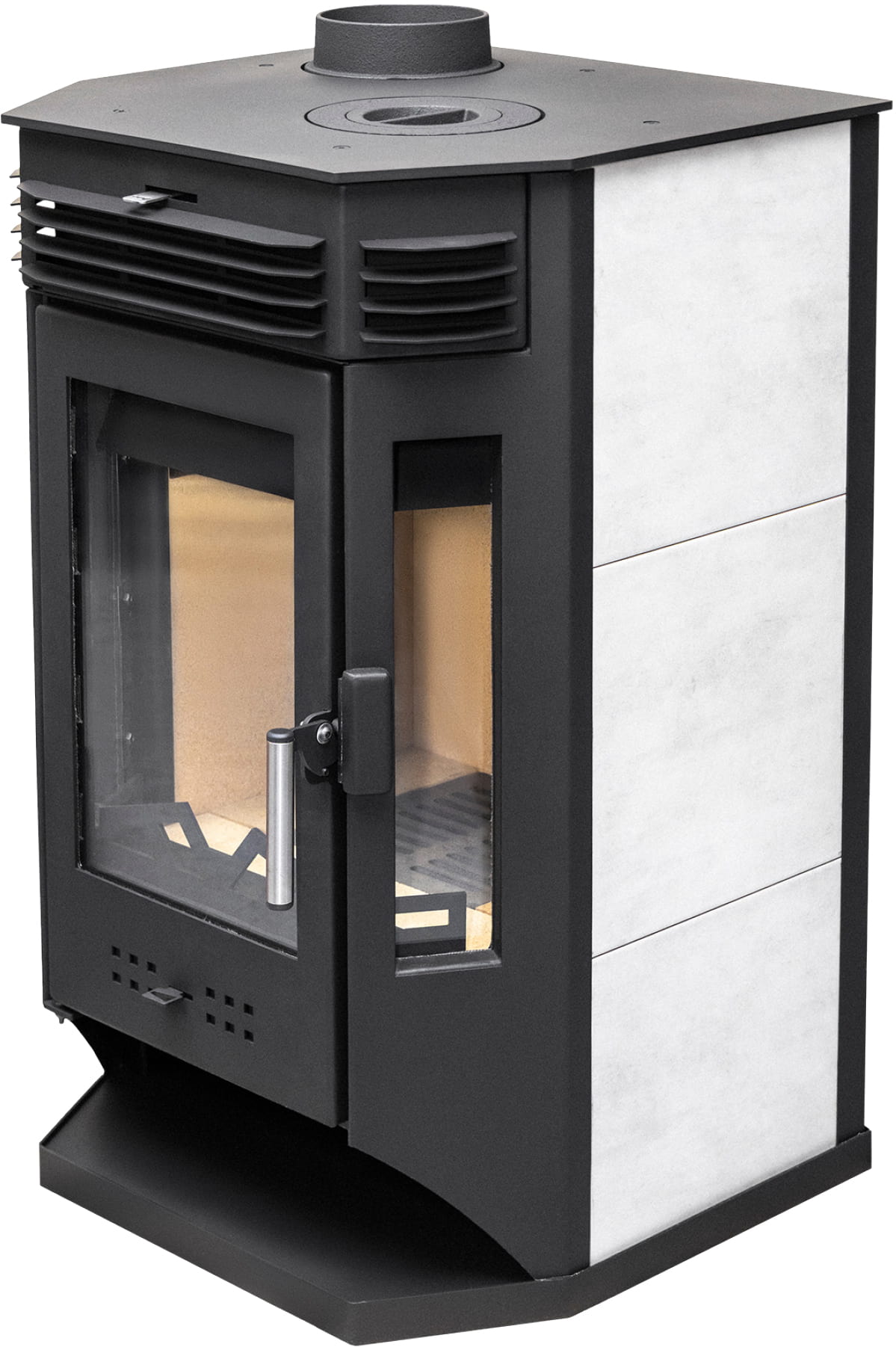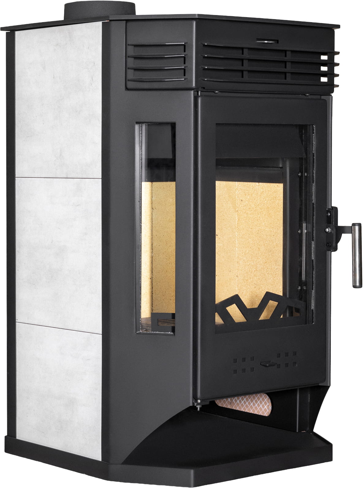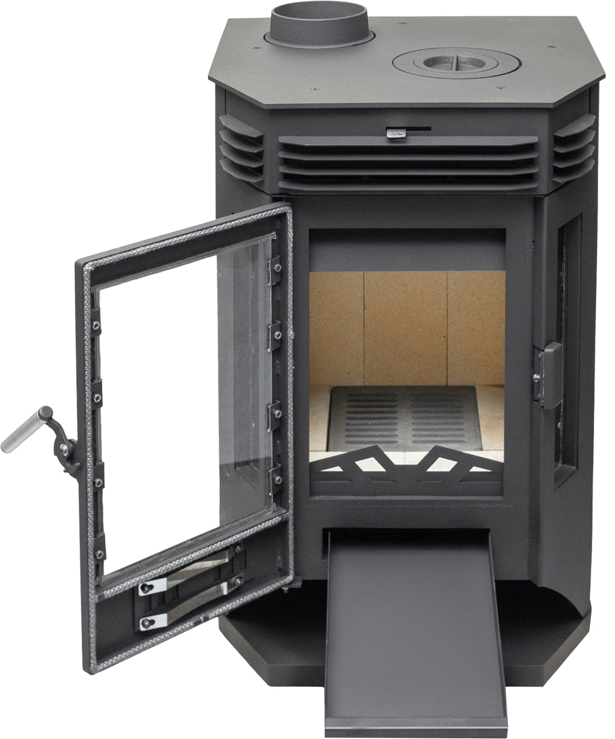 Три независимых стекла открывают отличный вид на огонь. Модель оснащена системой "Чистое стекло". Футеровка топки выполнена из шамота бежевого цвета. Внизу расположена ниша, которую можно использовать как дровник. На верхней панели размещена варочная поверхность для приготовления пищи или напитков. Дымоход диаметром 150 мм подключается сверху или сзади. При заднем подключении дымохода верхний выход можно использовать как дополнительную конфорку.
