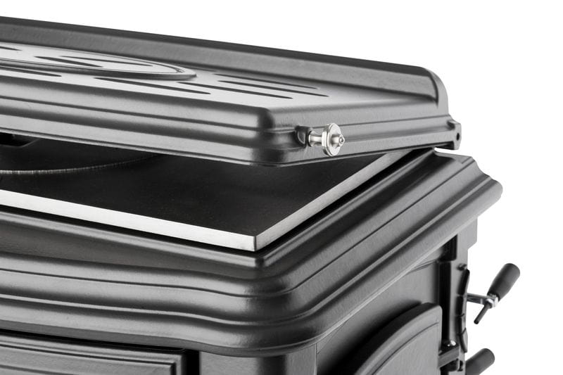 Большое прямое стекло позволит наблюдать за процессом горения. Печь оснащена дополнительной боковой дверцей для облегчения загрузки дров.Футеровка — из чугунных плит. На дне топки размещена круглая колосниковая решетка. Дымоход диаметром 150 / 180 мм подключается сзади.