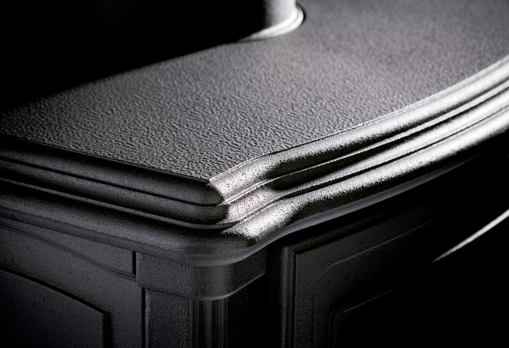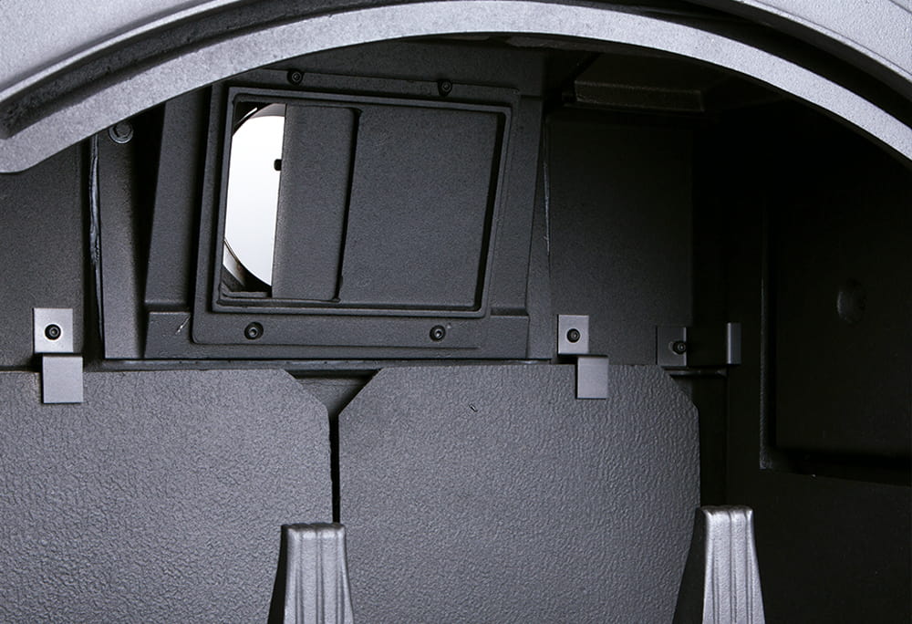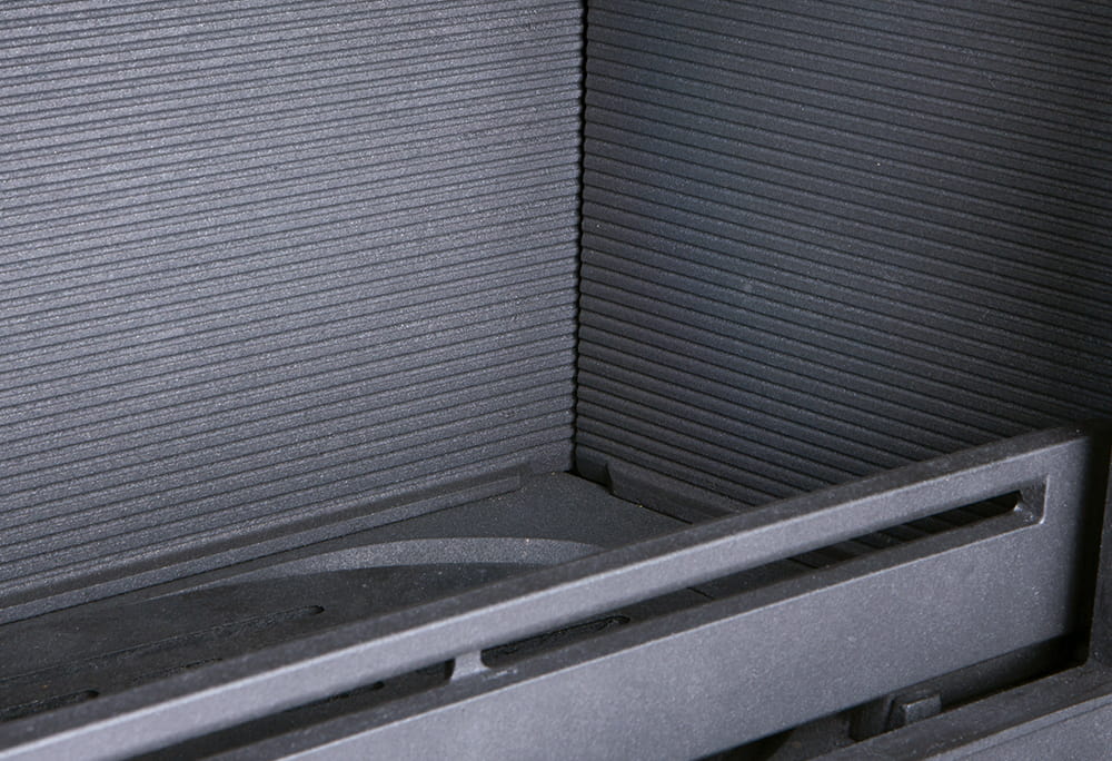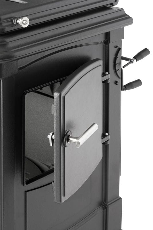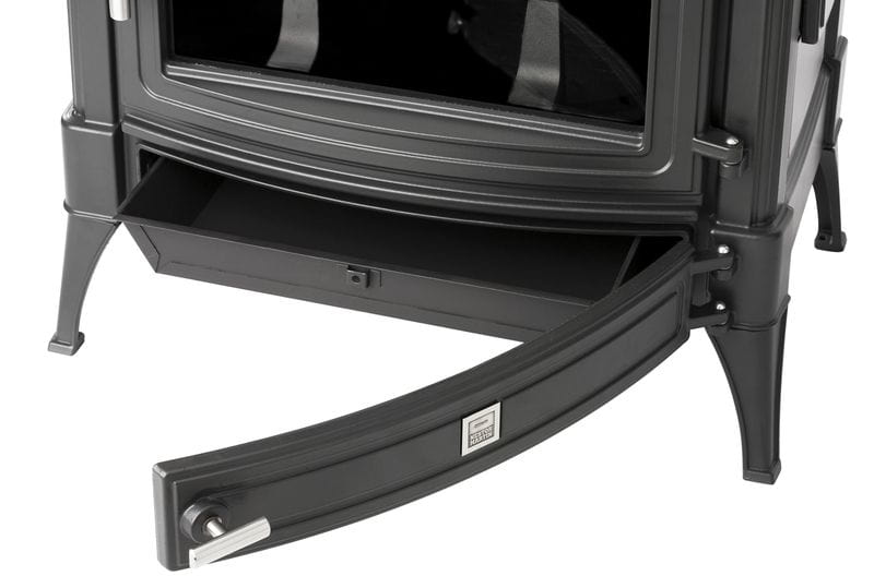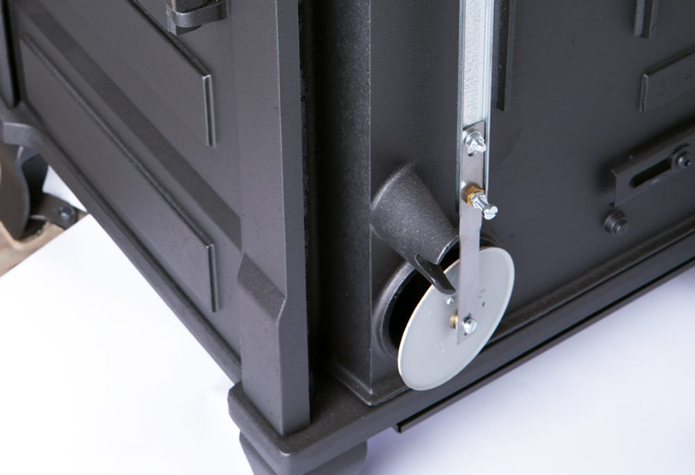 Большое прямое стекло позволит наблюдать за процессом горения. Печь оснащена дополнительной боковой дверцей для облегчения загрузки дров. Футеровка — из чугунных плит. На дне топки размещена круглая колосниковая решетка. Дымоход диаметром 130 / 150 мм подключается сверху или сзади.