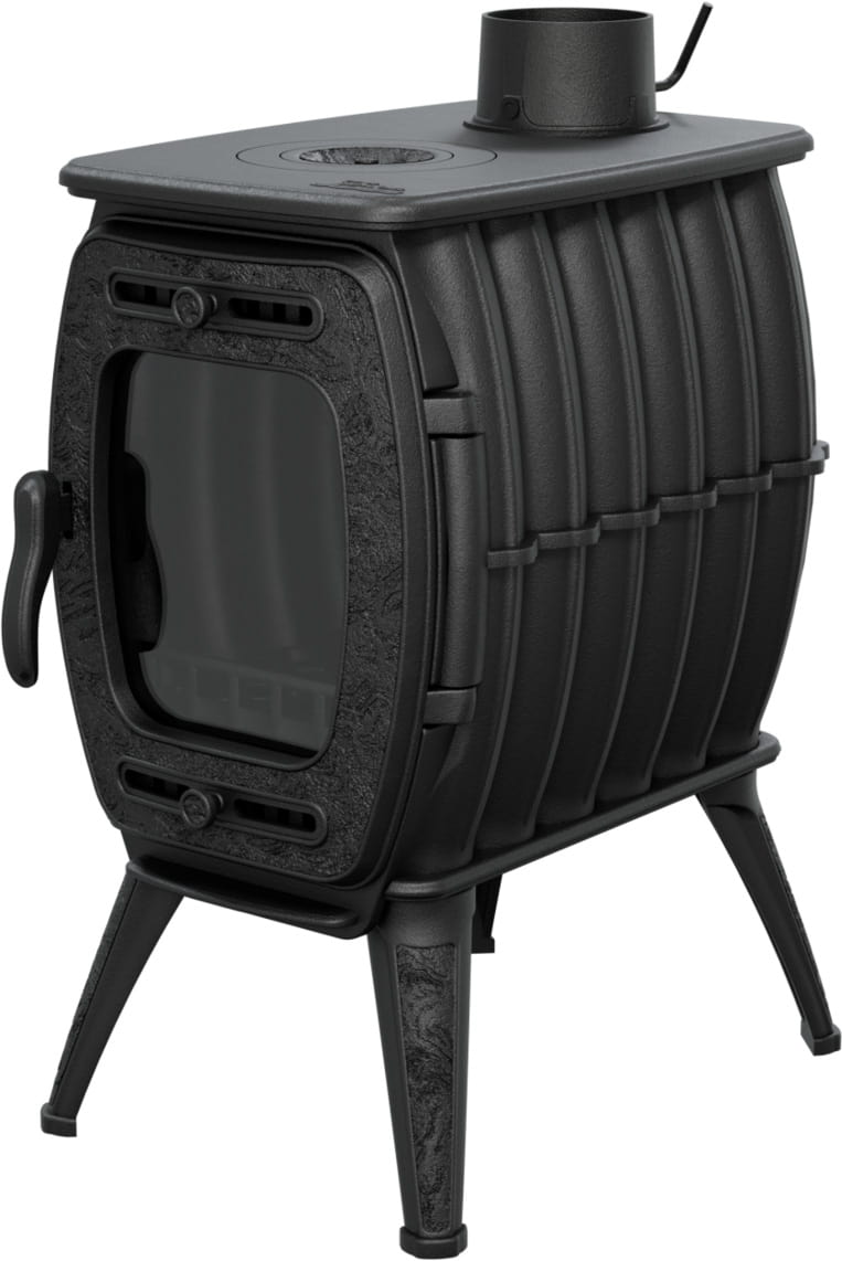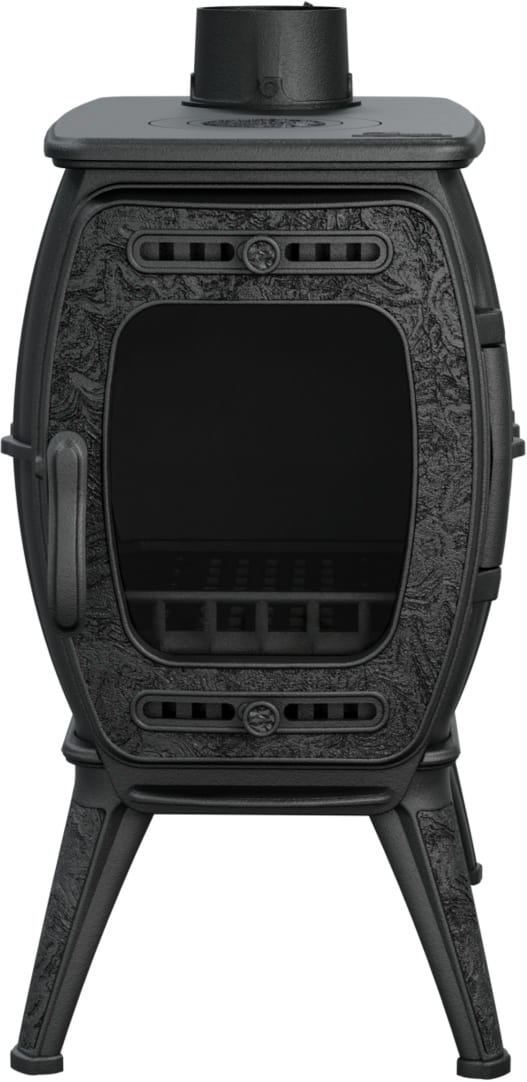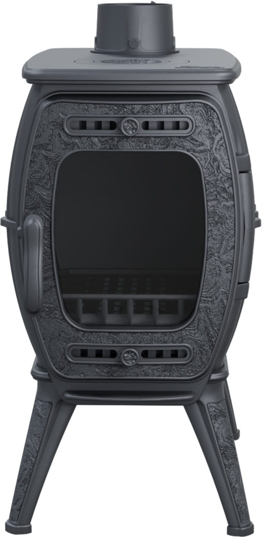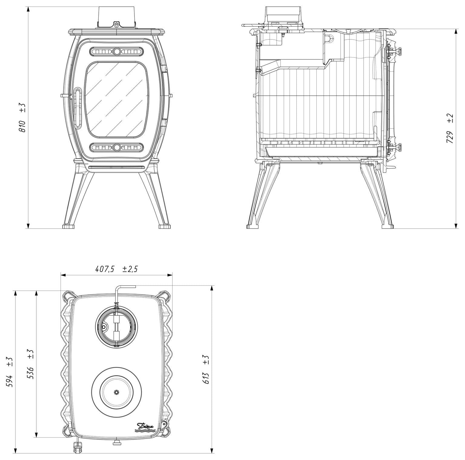 Прямое стекло без перемычек открывает отличный вид на огонь. Верхняя панель оснащена чугунной варочной поверхностью. Внутри топочной камеры установлен ограничитель выпадения дров. Для регулировки тяги патрубок оснащен шибером. Дымоход диаметром 115/130 мм подключается сверху или сзади.