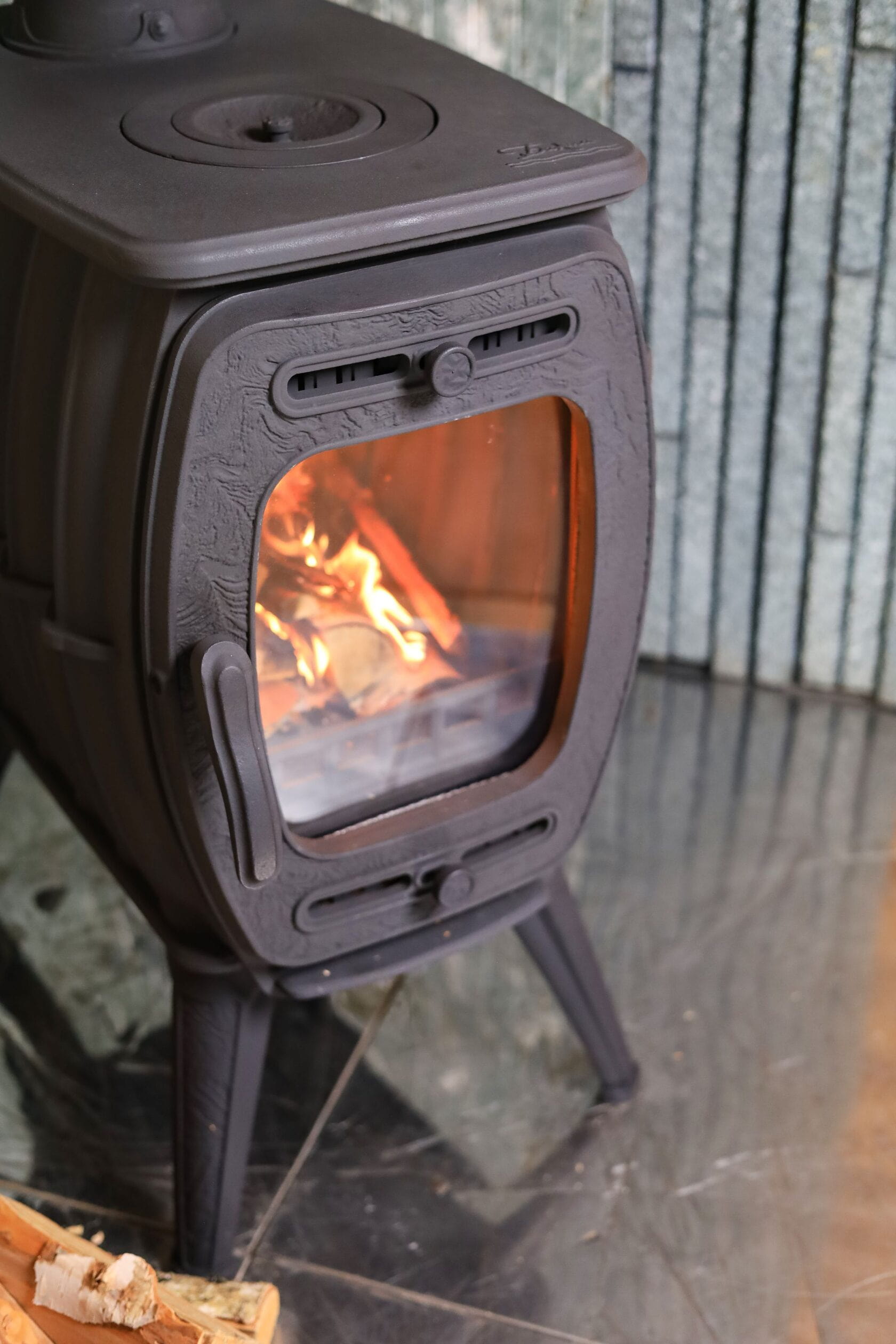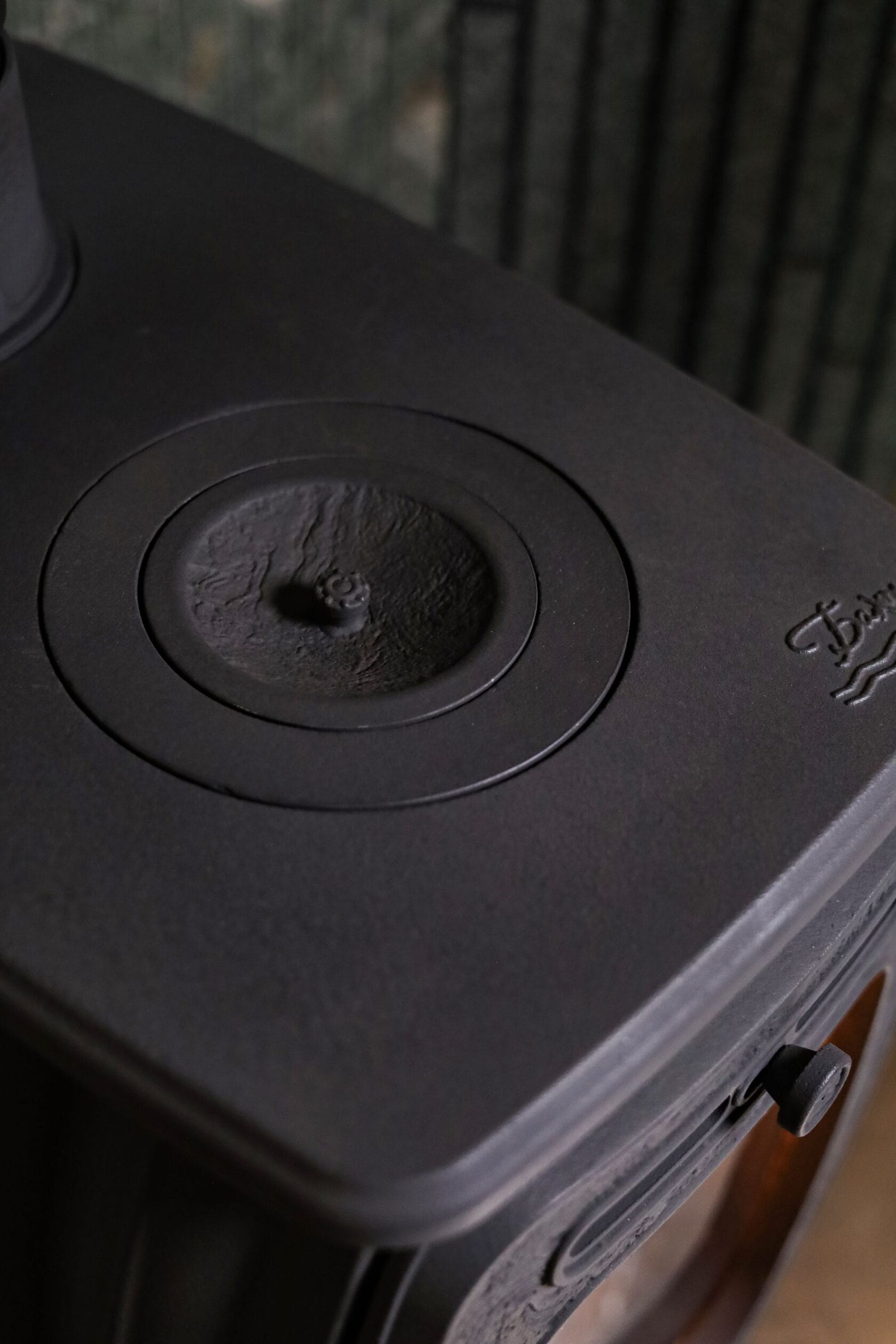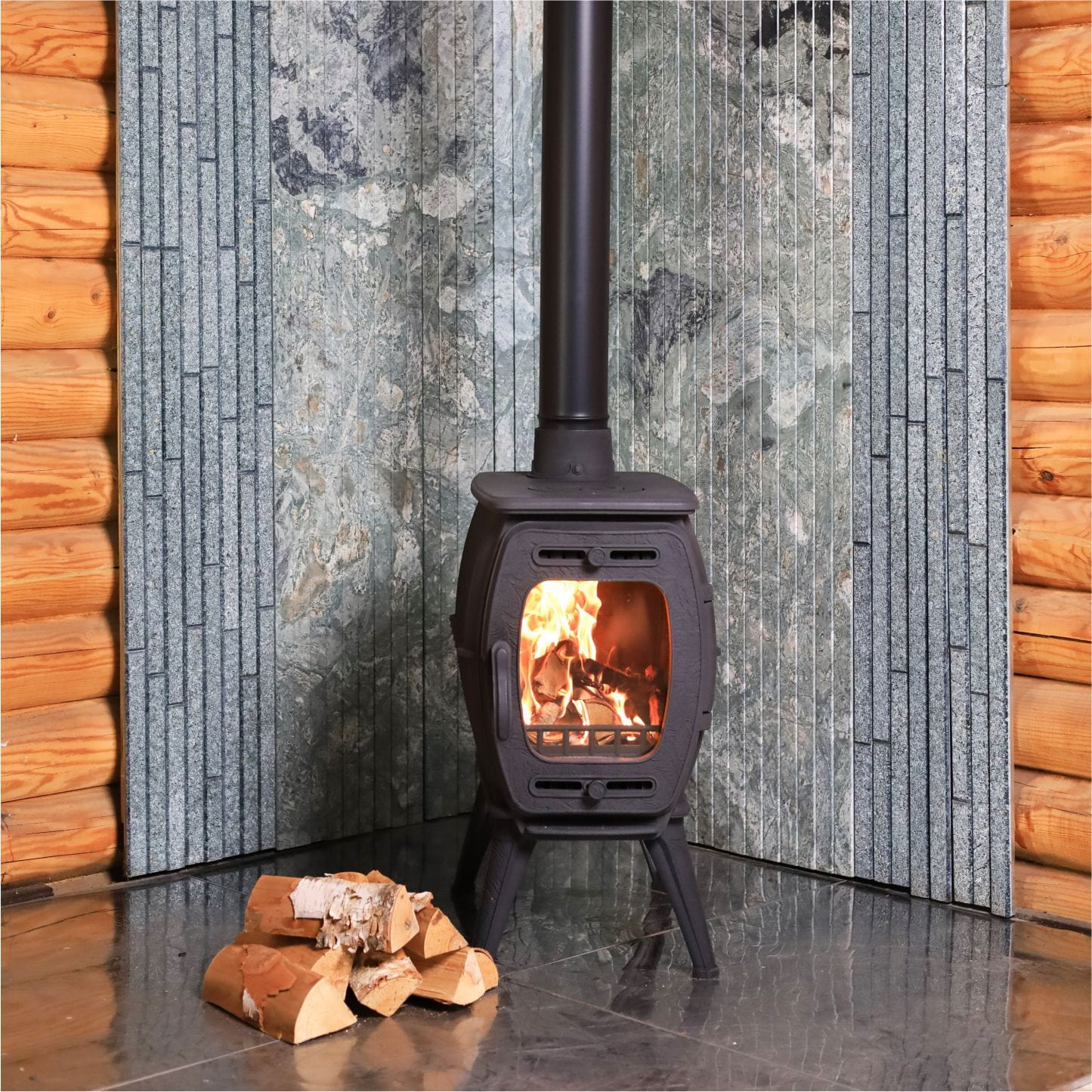 Прямое стекло без перемычек открывает отличный вид на огонь. Верхняя панель оснащена чугунной варочной поверхностью. Внутри топочной камеры установлен ограничитель выпадения дров. Для регулировки тяги патрубок оснащен шибером. Дымоход диаметром 115/130 мм подключается сверху или сзади.