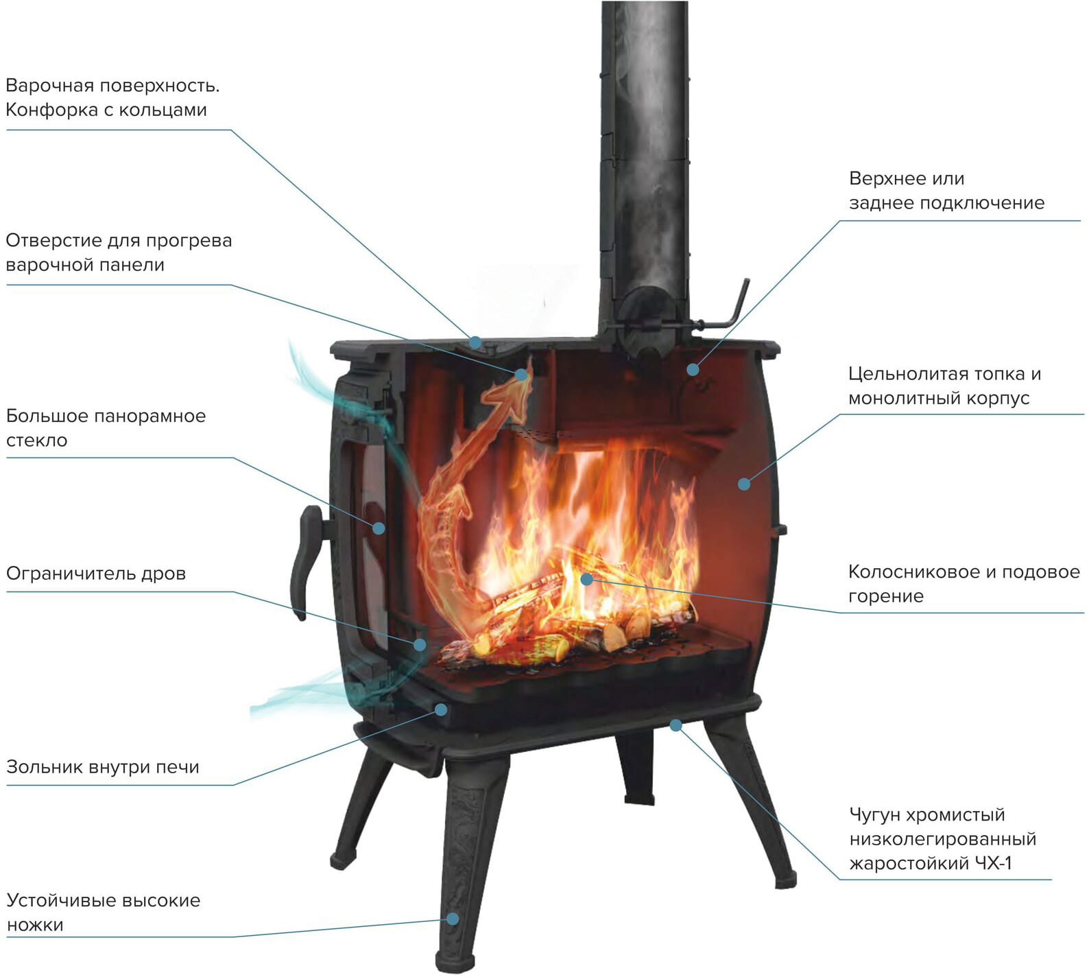 - Три режима использования: режим естественного горения, длительного горения и тления;