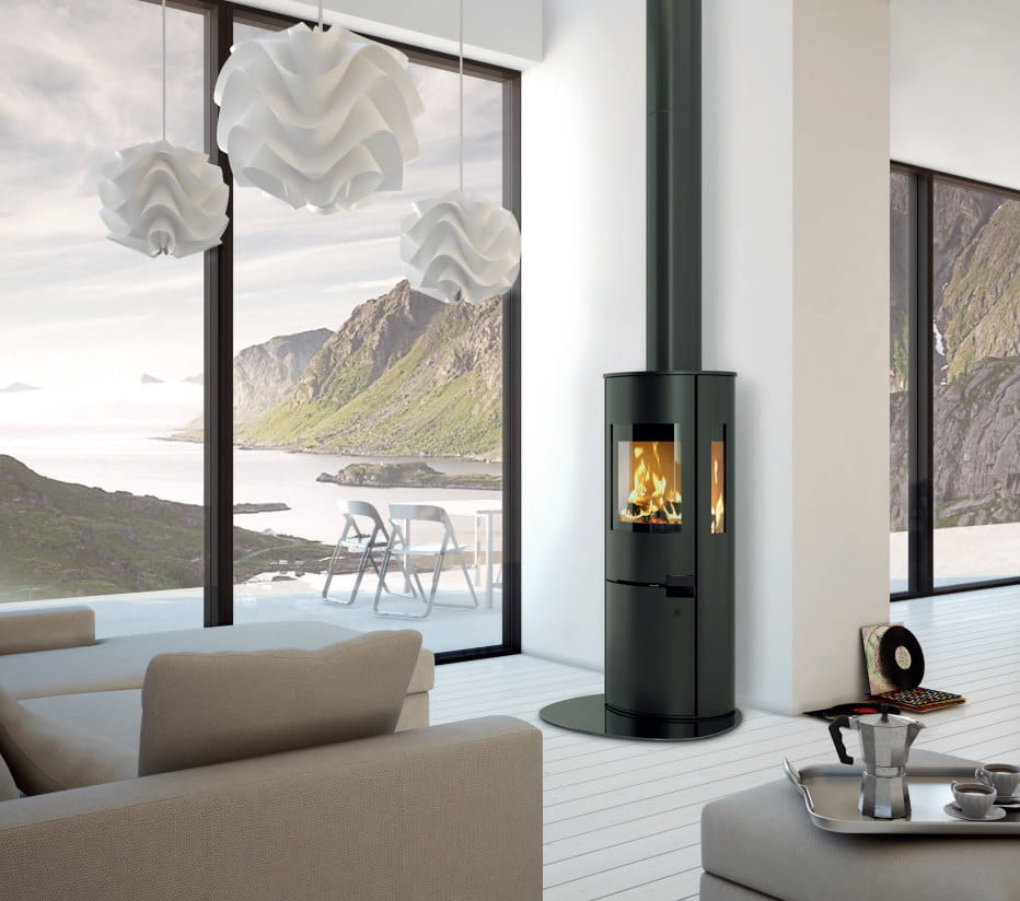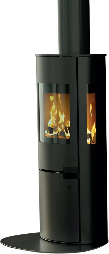 Форма печей Sirius напоминает цилиндр. В нижней части печи предусмотрено отделение для хранения дров, скрытое дверцей.