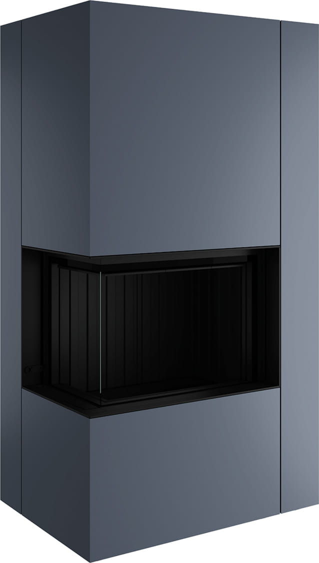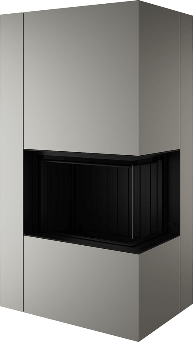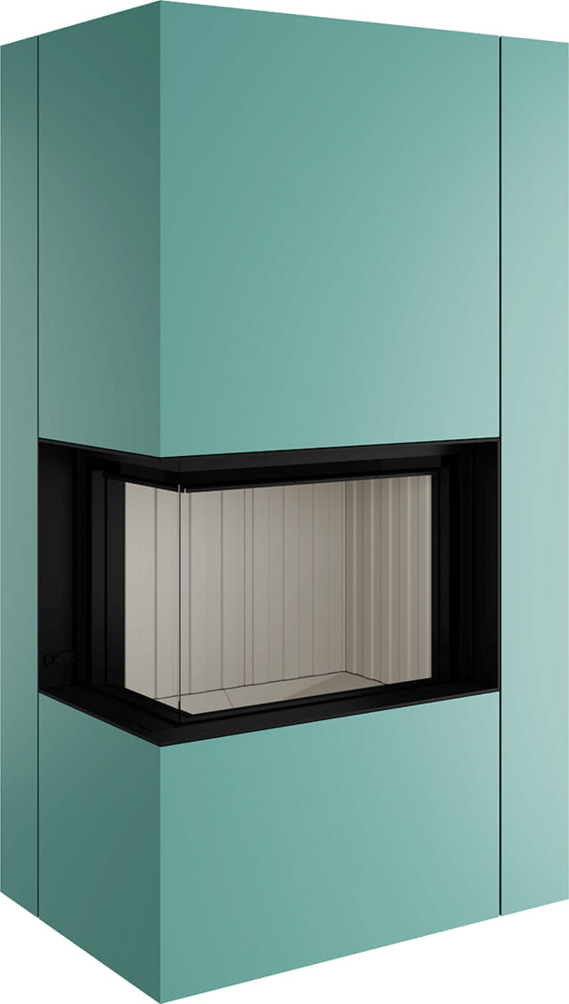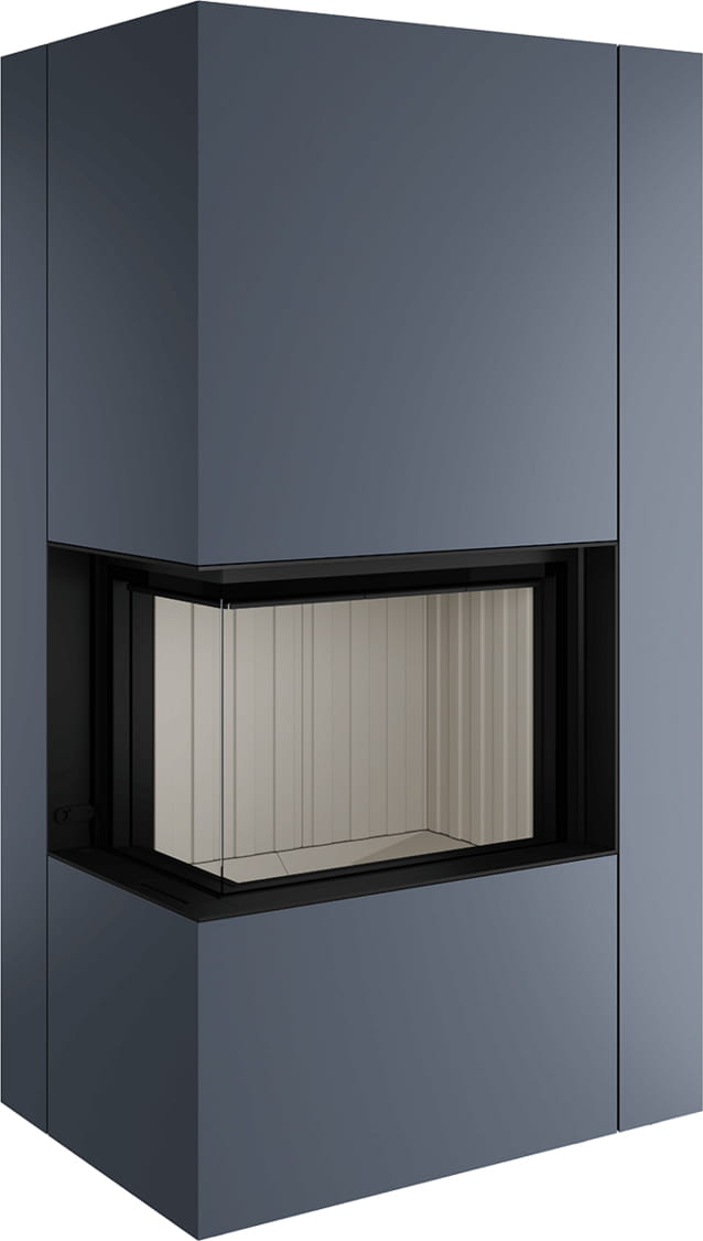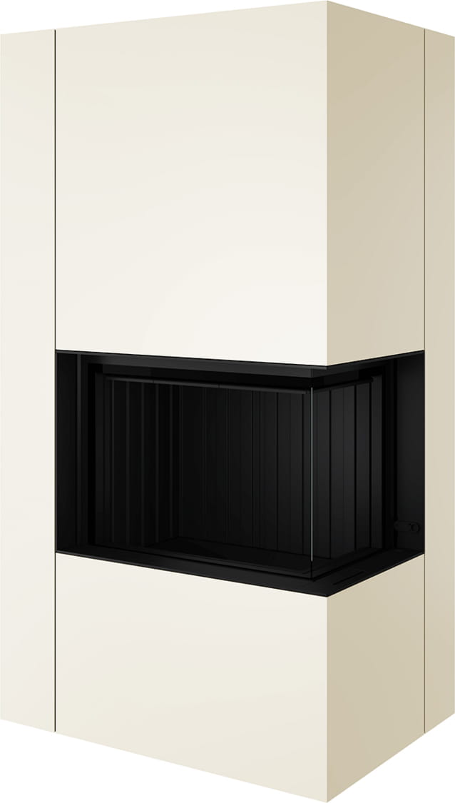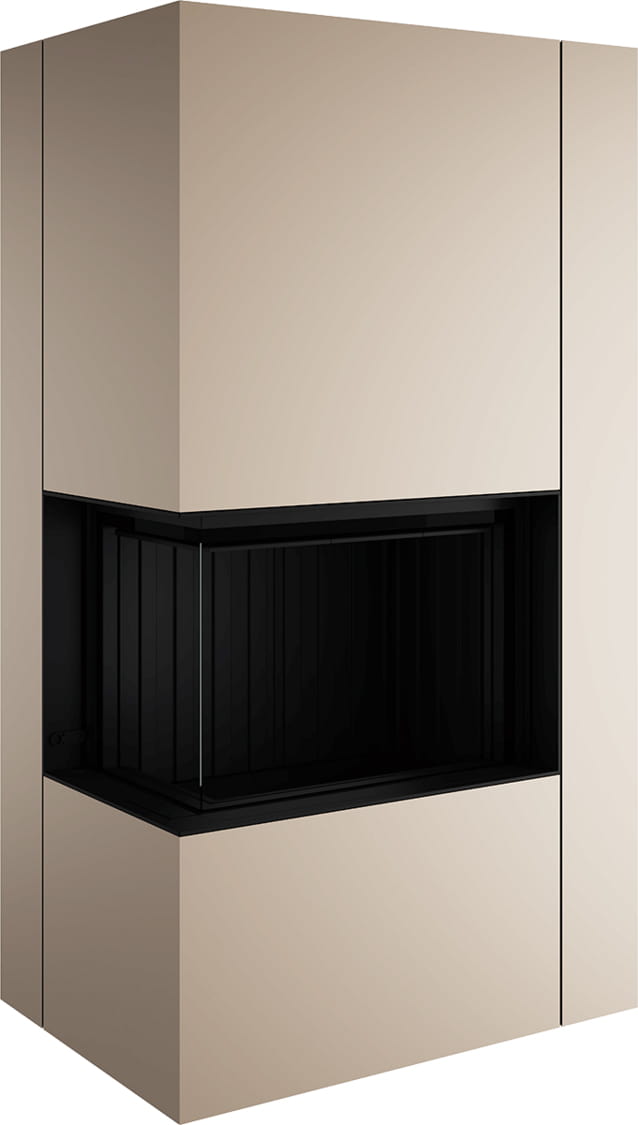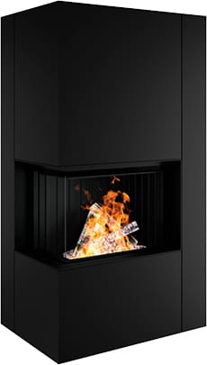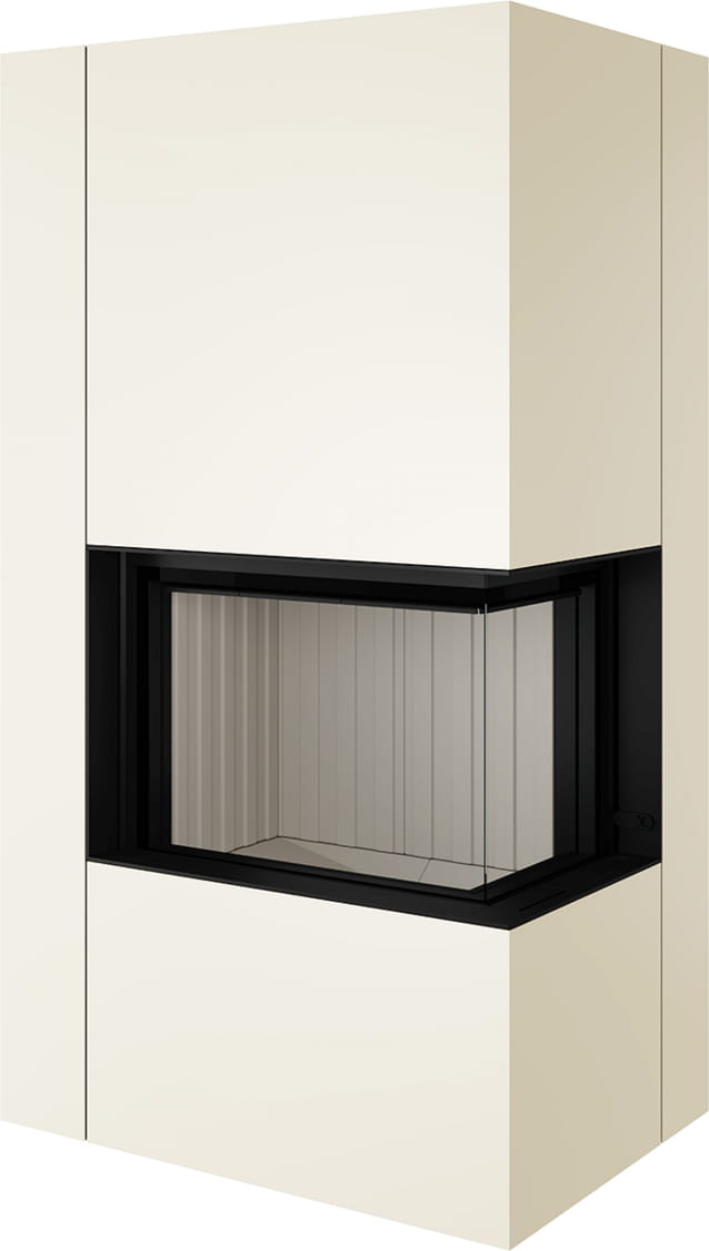 Очаг прямоугольной формы, печь можно разместить как у стены, так и в углу комнаты. Два стекла открывают отличный вид на огонь. Второе стекло расположено слева (2L) или справа (2R). Футеровка топки выполнена из шамота белого (опционально черного) цвета. Очаг с возможностью притока воздуха извне. Высота модели — 1775 мм. Дымоход диаметром 200 мм подключается сверху или сзади.