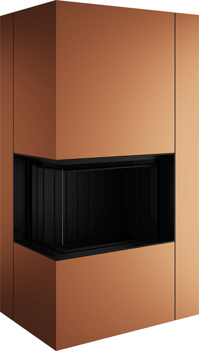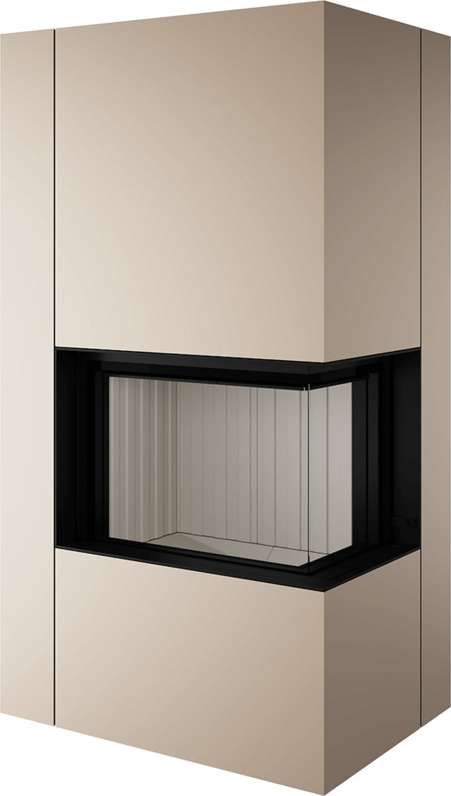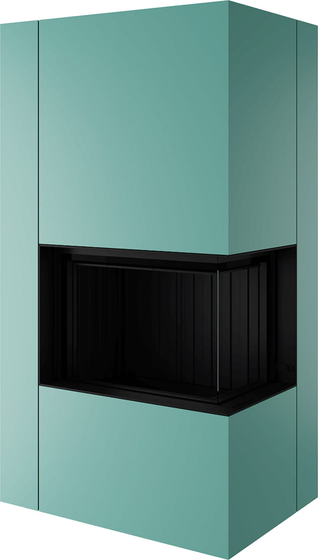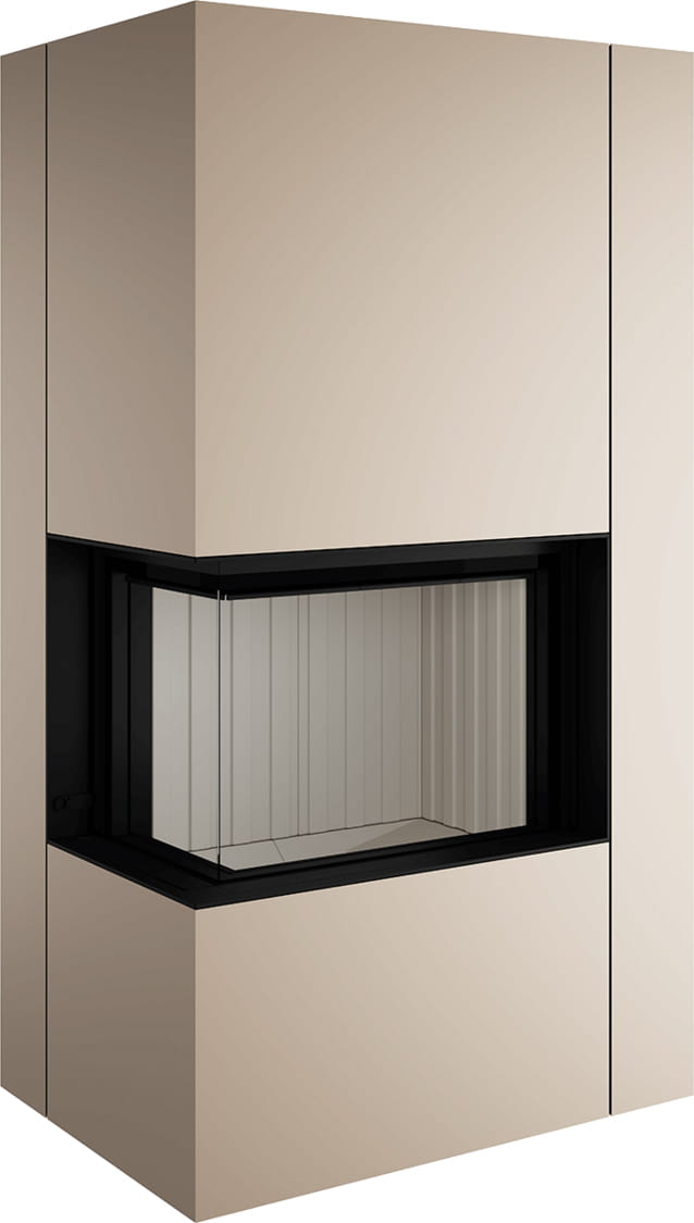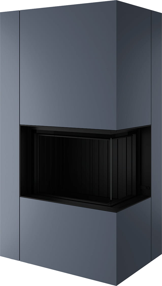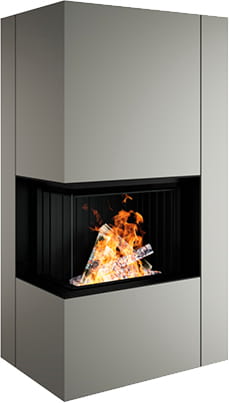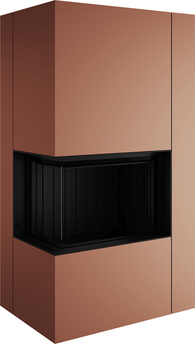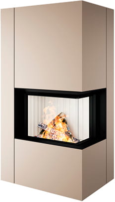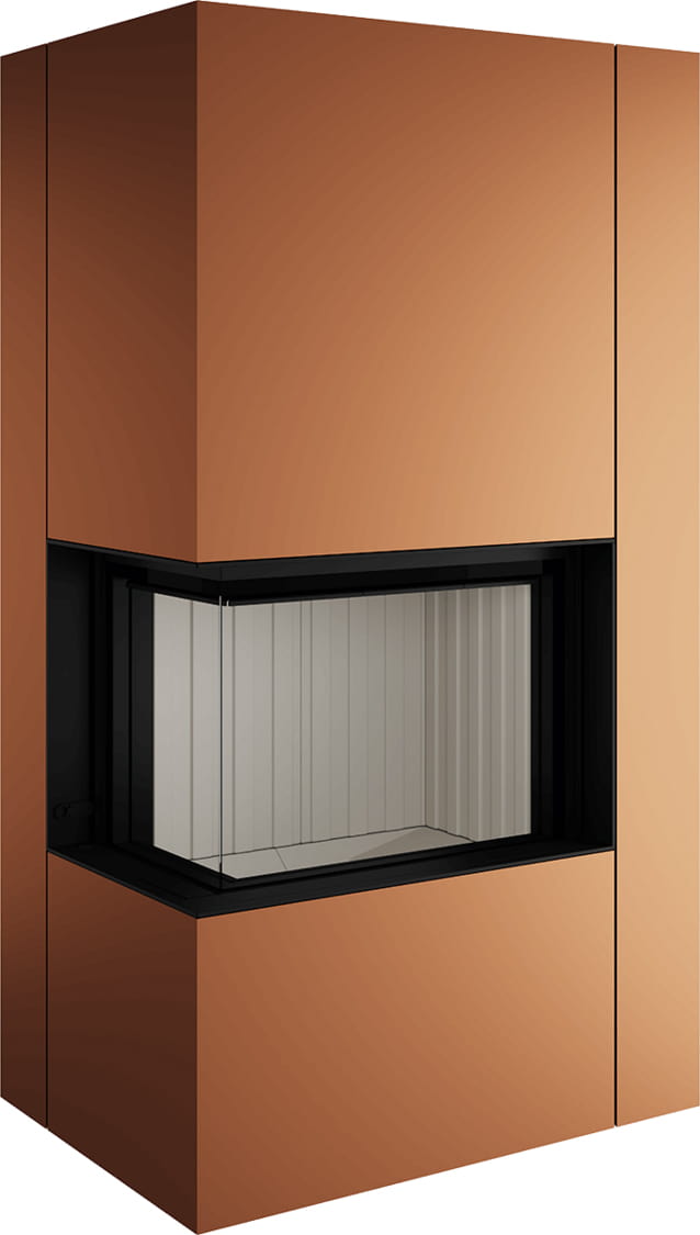 Очаг прямоугольной формы, печь можно разместить как у стены, так и в углу комнаты. Два стекла открывают отличный вид на огонь. Второе стекло расположено слева (2L) или справа (2R). Футеровка топки выполнена из шамота белого (опционально черного) цвета. Очаг с возможностью притока воздуха извне. Высота модели — 1775 мм. Дымоход диаметром 200 мм подключается сверху или сзади.