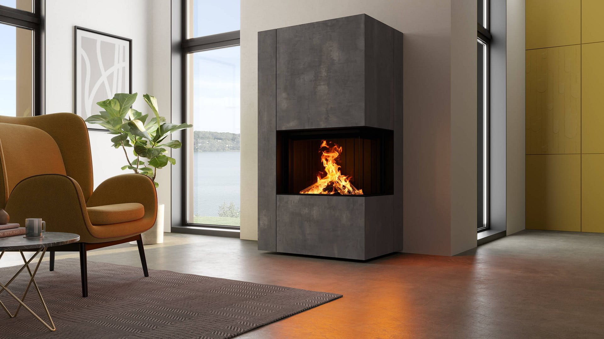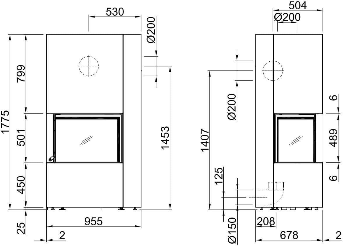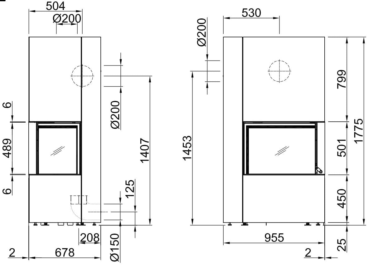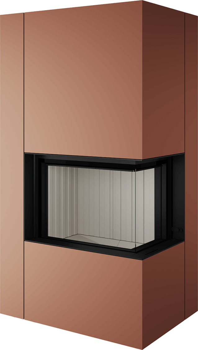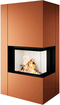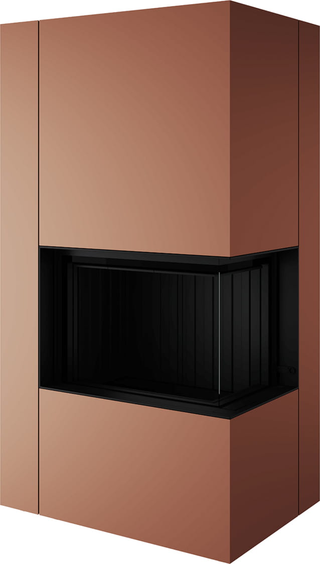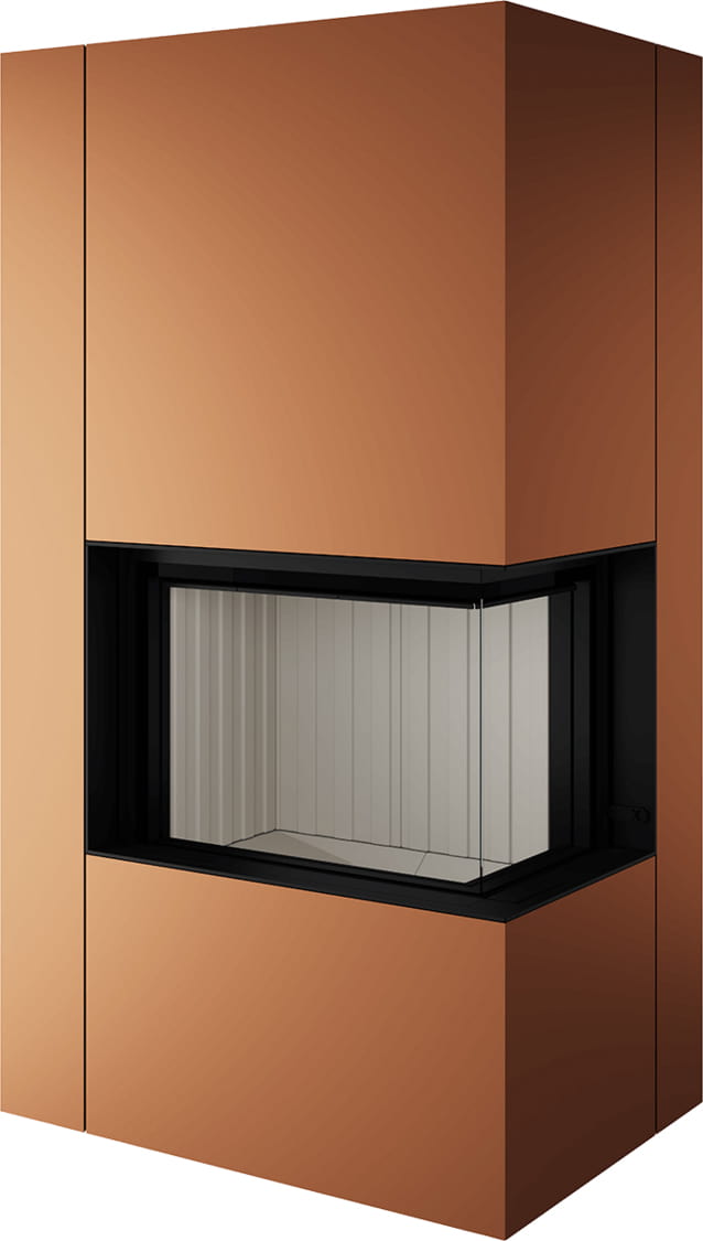 Очаг прямоугольной формы, печь можно разместить как у стены, так и в углу комнаты. Два стекла открывают отличный вид на огонь. Второе стекло расположено слева (2L) или справа (2R). Футеровка топки выполнена из шамота белого (опционально черного) цвета. Очаг с возможностью притока воздуха извне. Высота модели — 1775 мм. Дымоход диаметром 200 мм подключается сверху или сзади.