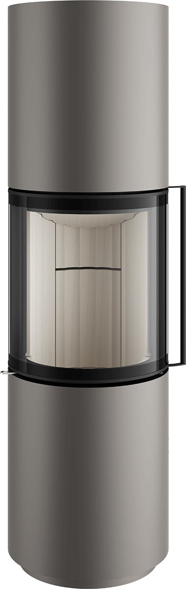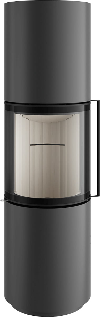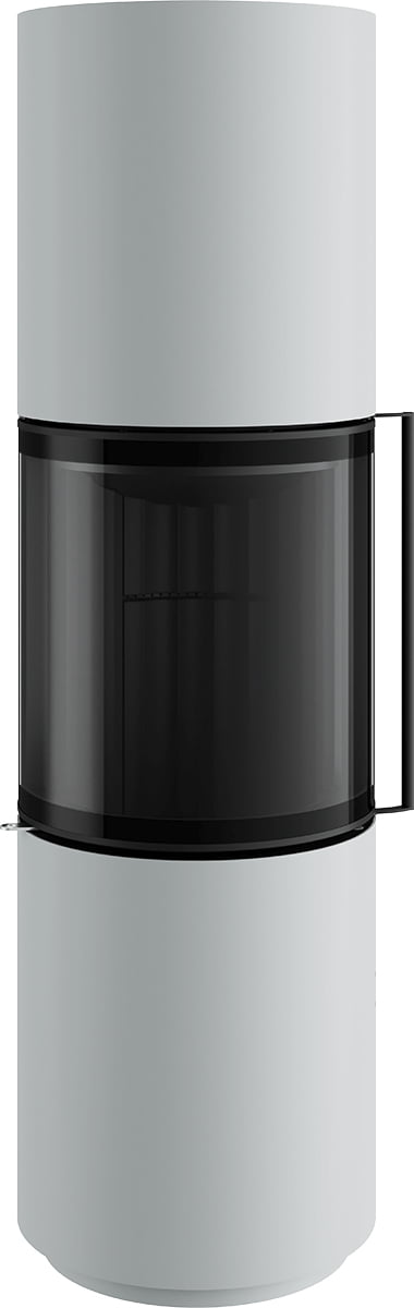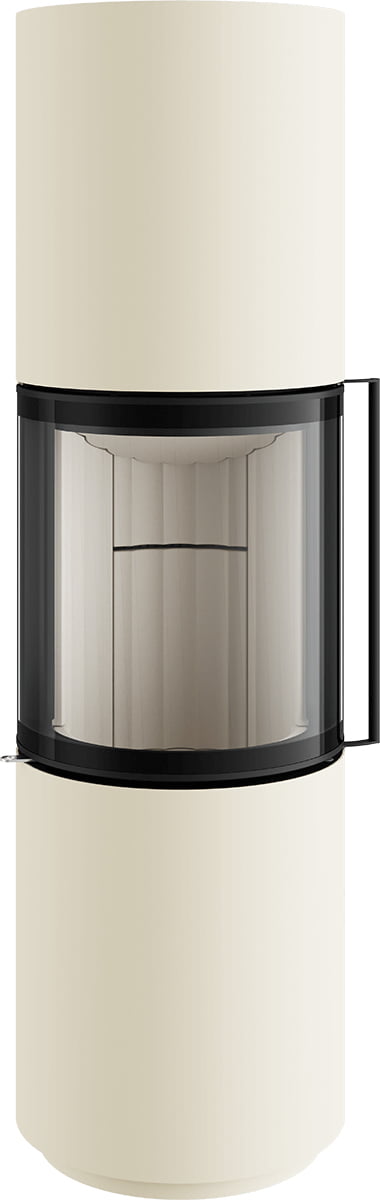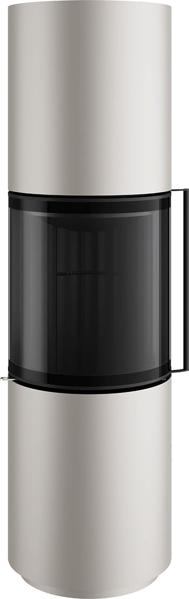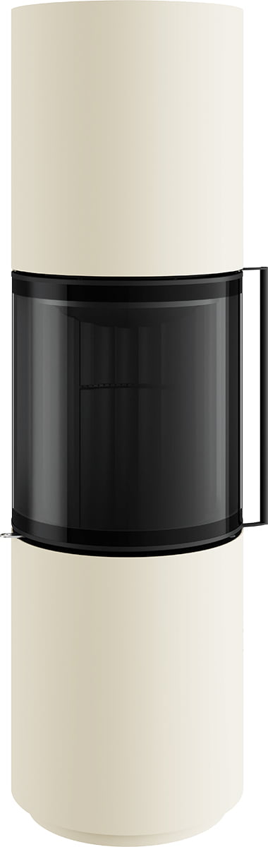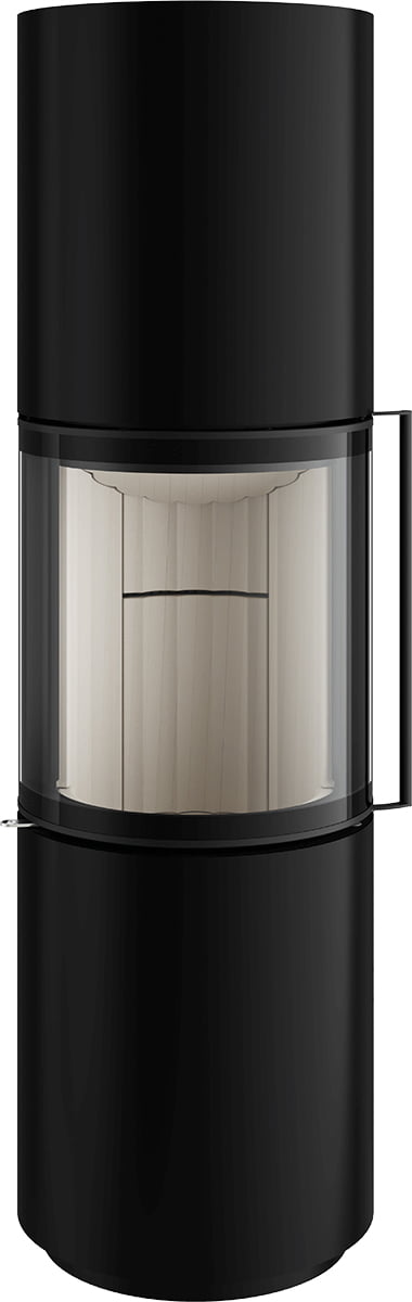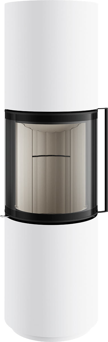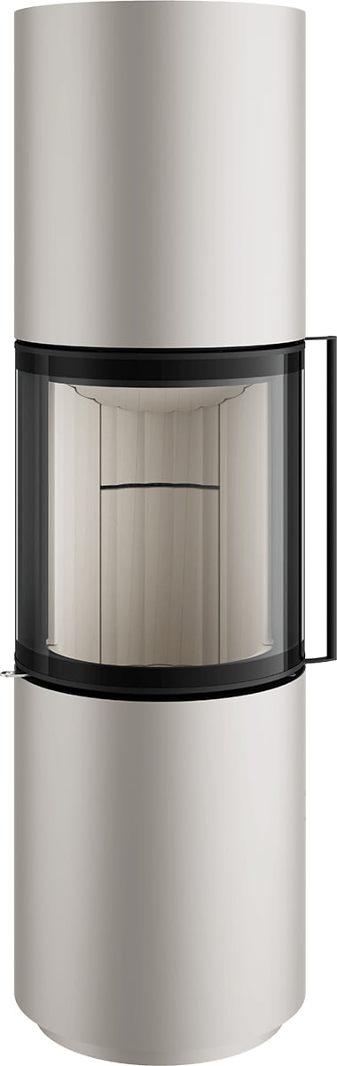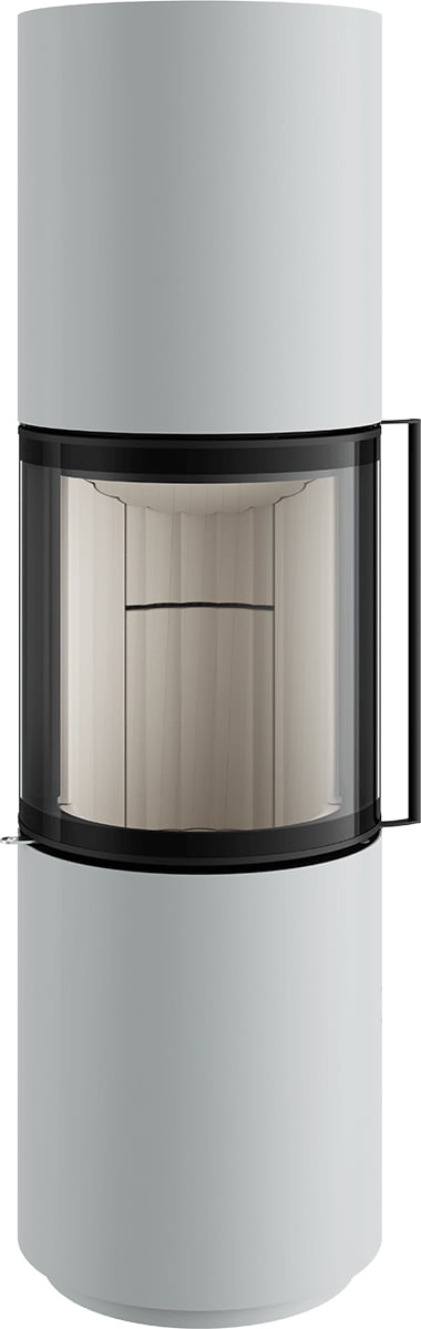 Очаг цилиндрической формы, печь можно разместить как у стены, так и в центре комнаты. Большое панорамное стекло открывает отличный вид на огонь. Футеровка топки выполнена из шамота белого (опционально черного) цвета. Очаг с возможностью притока воздуха извне. Высота модели — 1646 мм. Дымоход диаметром 150 мм подключается сверху или сзади.