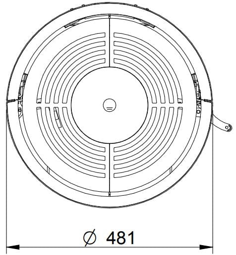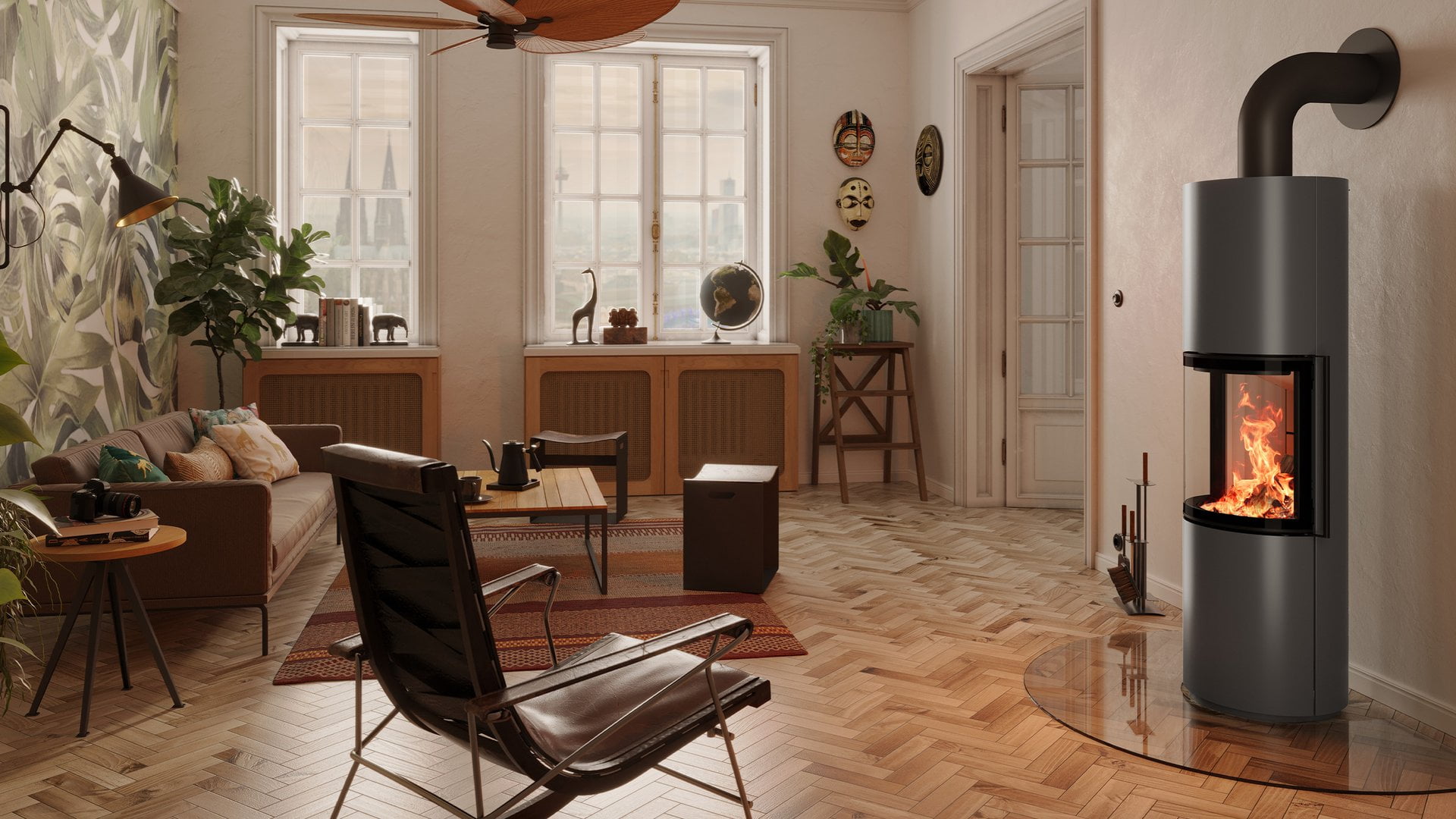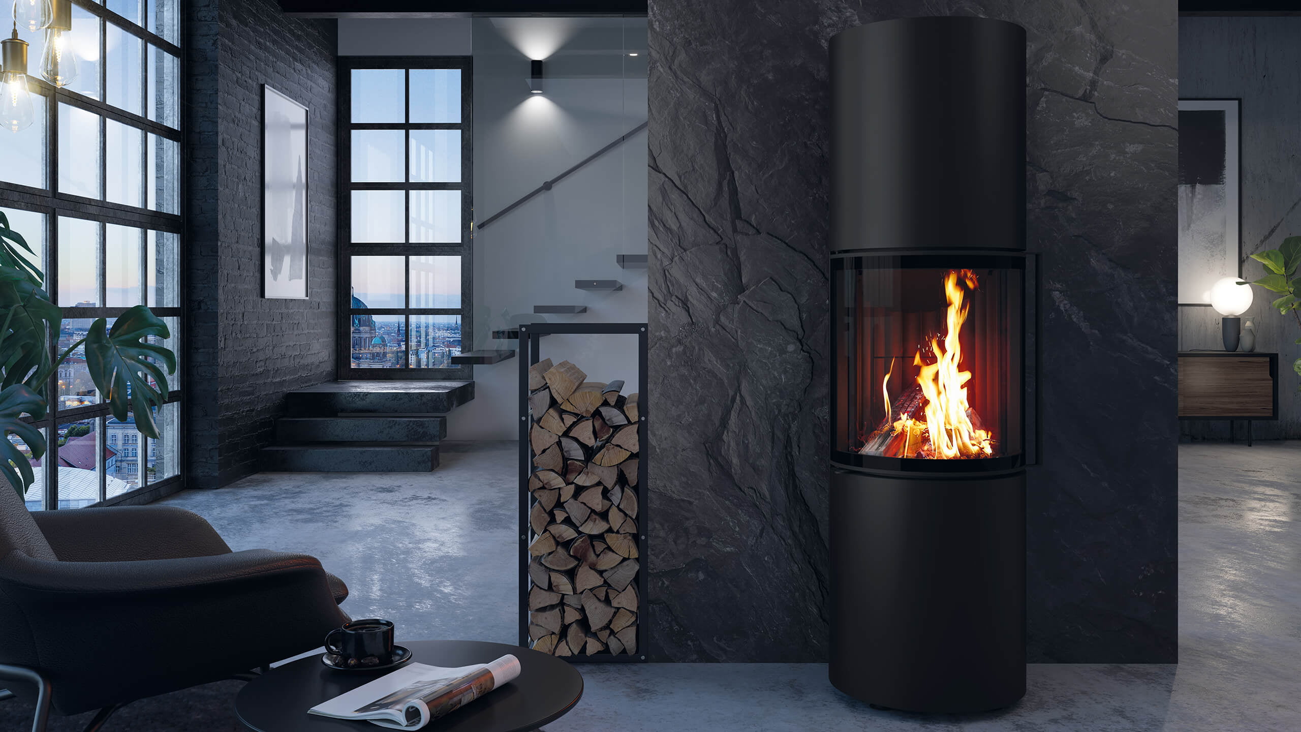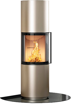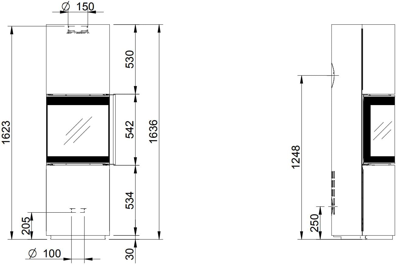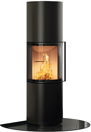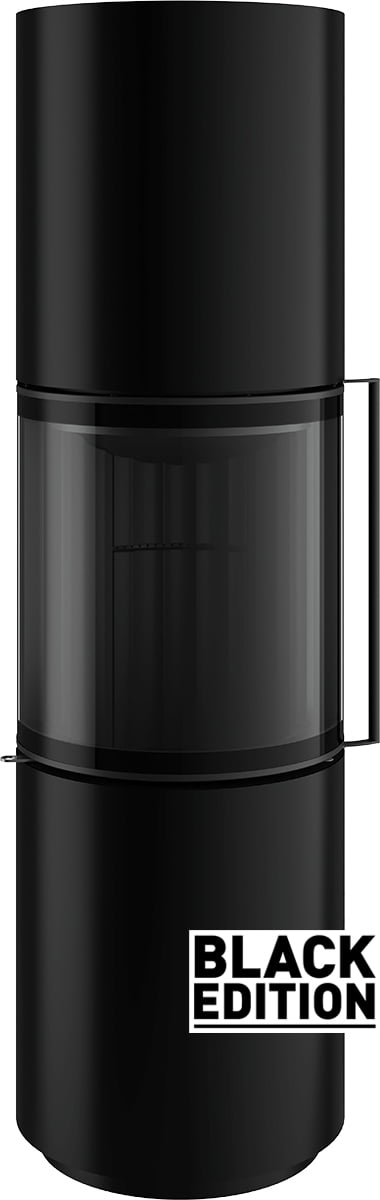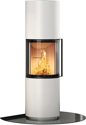Очаг цилиндрической формы, печь можно разместить как у стены, так и в центре комнаты. Большое панорамное стекло открывает отличный вид на огонь. Футеровка топки выполнена из шамота белого (опционально черного) цвета. Очаг с возможностью притока воздуха извне. Высота модели — 1646 мм. Дымоход диаметром 150 мм подключается сверху или сзади.