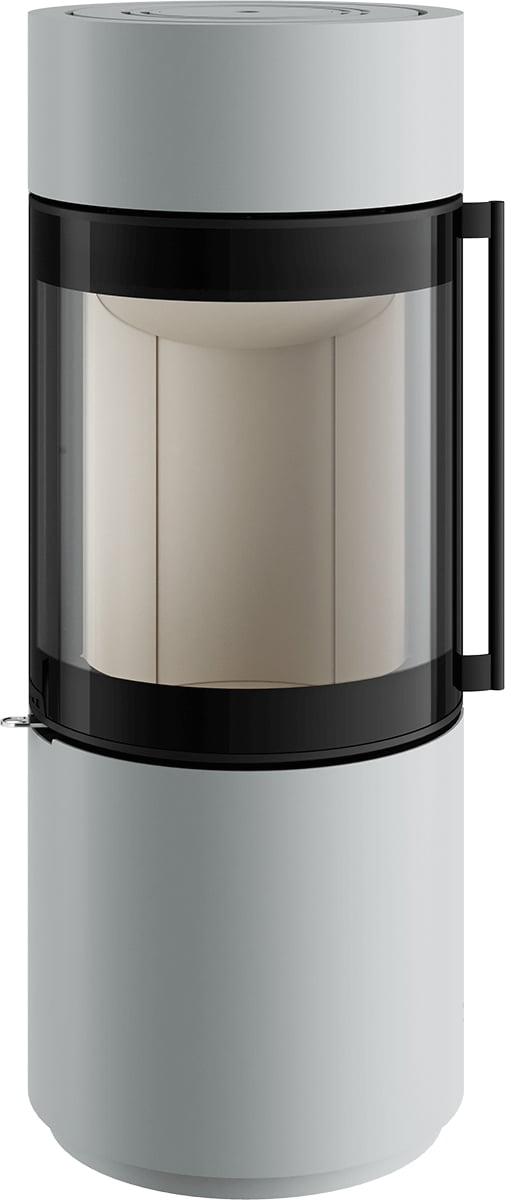 Очаг цилиндрической формы, печь можно разместить как у стены, так и в центре комнаты. Большое панорамное стекло открывает отличный вид на огонь. Футеровка топки выполнена из шамота белого (опционально черного) цвета. Очаг с возможностью притока воздуха извне. Высота модели — 1142 мм. Дымоход диаметром 150 мм подключается сверху или сзади.