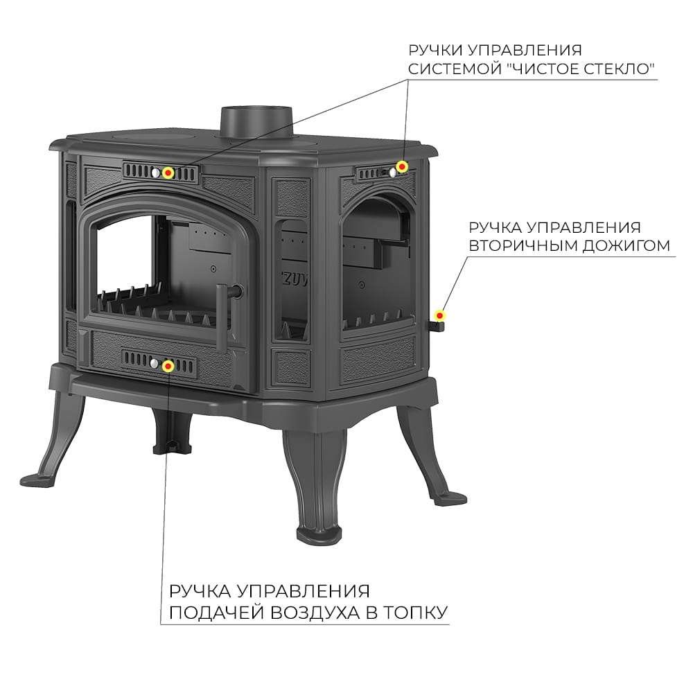 - Регулировка притока первичного и вторичного воздуха в камеру топки. Воздух в топку поступает через нижнее отверстие, чем больше открыта заслонка, тем больше воздуха поступает в топку и тем интенсивнее происходит горение. Сверху регулировка подачи воздуха на стекло, чтобы стекло меньше коптилось;
