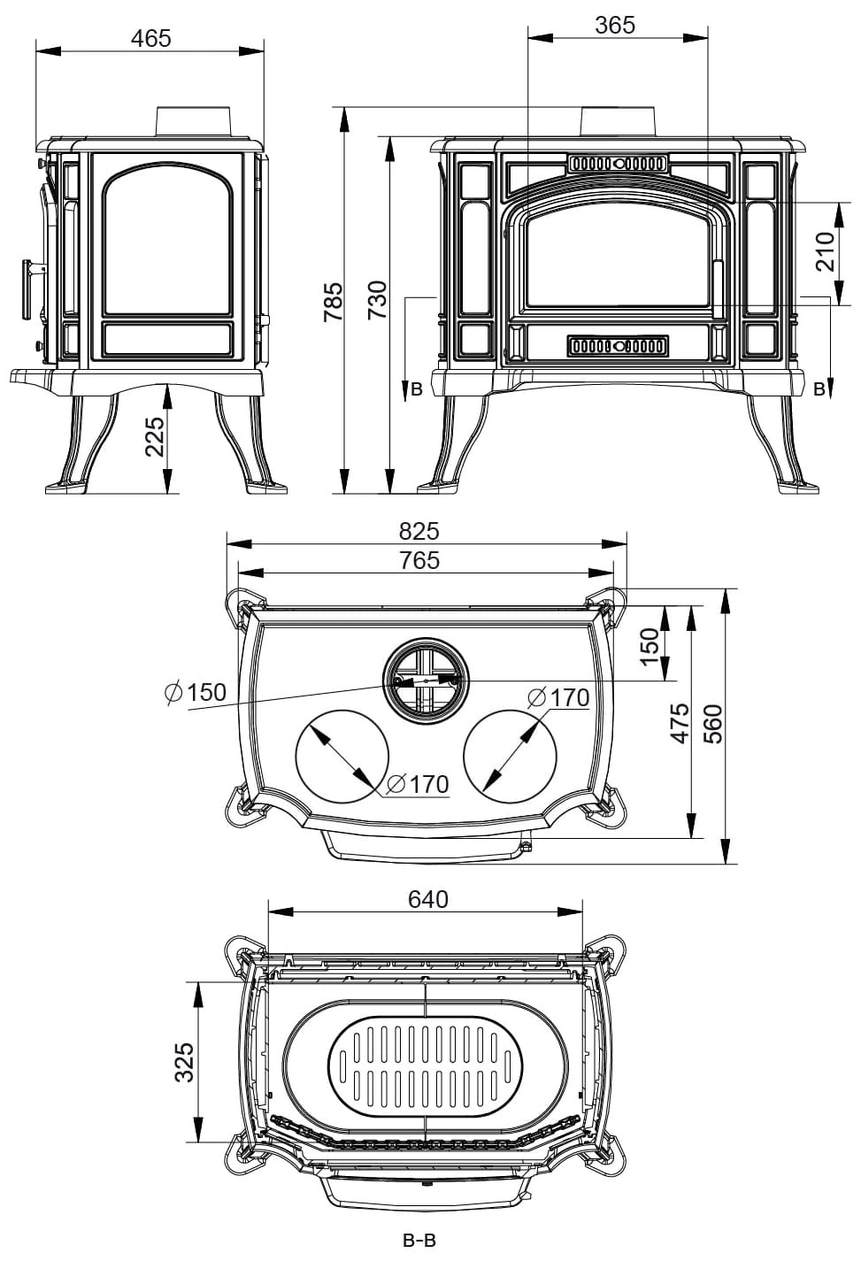 Модель обладает всеми современными технологиями горения: системой "Чистое стекло" для больших стёкол и вторичным дожигом газов. Верхняя панель снабжена двумя конфорками для приготовления пищи / напитков.Корпус печи выполнен в цвете Антрацит. Для подключения необходим дымоход диаметром 150 мм, который подключается сверху или сзади.