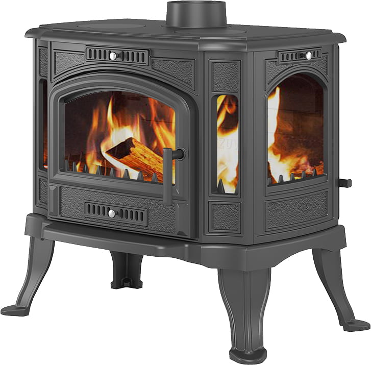 Печь-камин Везувий KZ-14PS (Везувий КЗ 14 ПС) выполнен из жаростойкого чугуна и, обладая мощностью 14 кВт, способен обогреть помещение до 280 м³. Устройство комплектуется чугунной дверкой с большим прямым стеклом и стеклянными вставками по обе стороны от него. Боковые стенки устройства тоже со стеклом — в итоге за огнём можно наблюдать с трёх сторон (обзор в 180º).