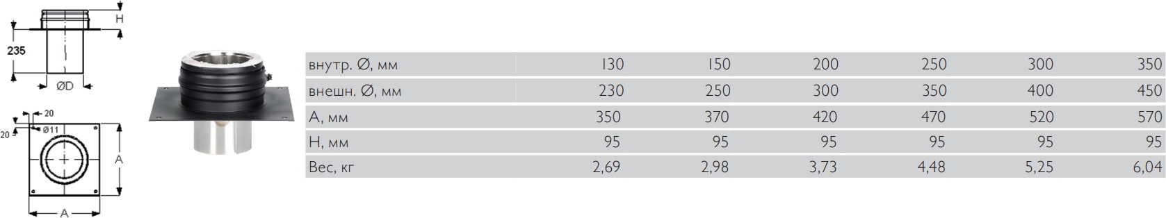 Используется для соединения кирпичной шахты прямоугольного сечения с двухконтурным стальным дымоходом Permeter 50.