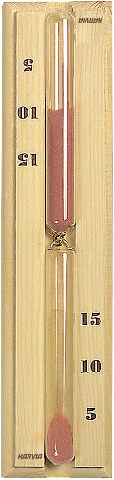 Песочные часы Harvia (Харвия) – аксессуар для отслеживания времени, проведенного в бане, с возможностью возобновления отсчета. Часы изготовлены из дерева. Прибор имеет углубление по всей длине корпуса, куда вставляются два сосуда (один из которых заполнен песком), соединенных узкой горловиной. Две шкалы с разных сторон рассчитаны на промежуток времени в 15 минут с отметками через каждые 5 минут.
