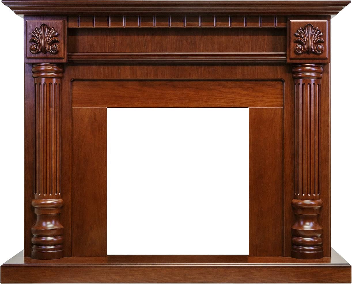 Корпус портала окрашен в цвет ореха. Зона по бокам от очага декорирована византийскими каннелированными колоннами с объемным орнаментом над ними. Боковые стойки между собой соединены карнизом с незатейливим узором. Изделие стоит на высоком выступающем пьедестале, сверху имеет широкую каминную полку, которая без проблем позволяет разместить различные аксессуары в виде статуэток или фотографий.