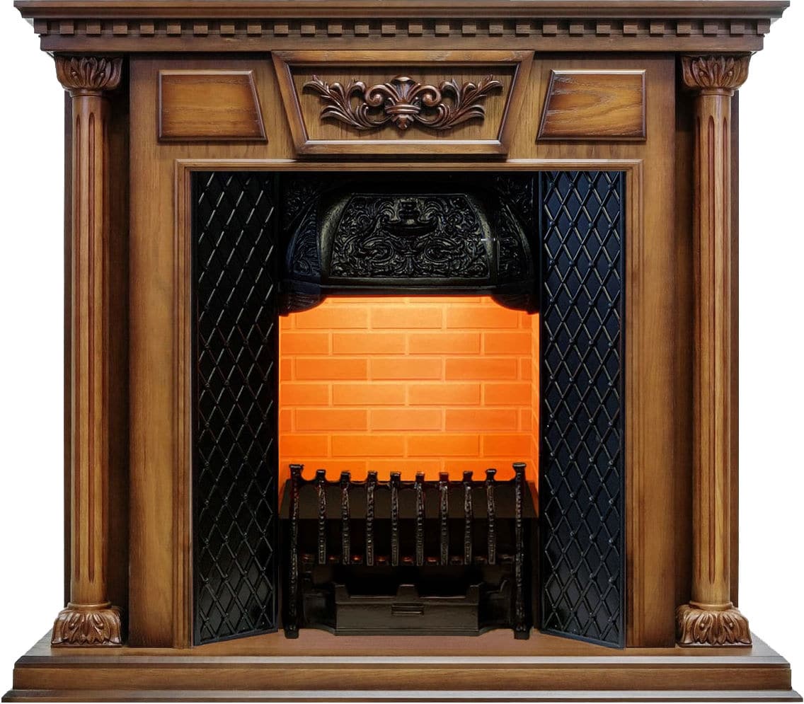 Данная модель под очаг Cassette 400 дополнена декоративной решеткой и футеровкой внутренних стенок топки, имитирующей кирпичную кладку. Портал представлен в двух цветовых решениях: дуб антик и белый дуб с налетом патины с золотом. Подойдет для интерьера в классическом стиле.