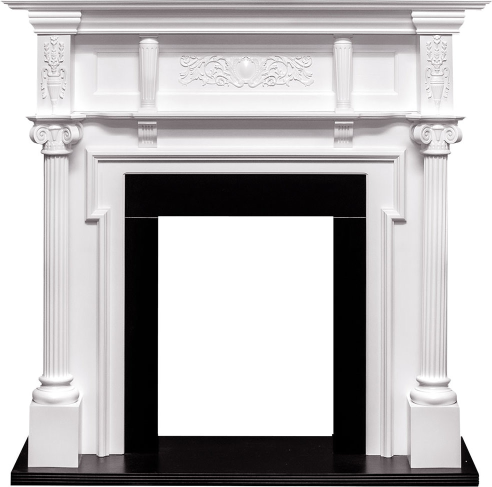 Корпус окрашен в белый цвет, основание портала и рамка — в черный. Подойдет для интерьера в классическом стиле.