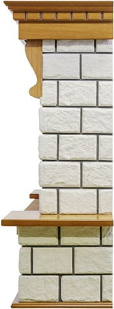 Портал возвышается на высоком пьедестале, декорированном полированной полкой. Боковые стойки украшены кронштейнами, под очагом находится аркообразная ниша, в которой можно разместить поленья. Сверху изделие оснащено узкой каминной полкой.