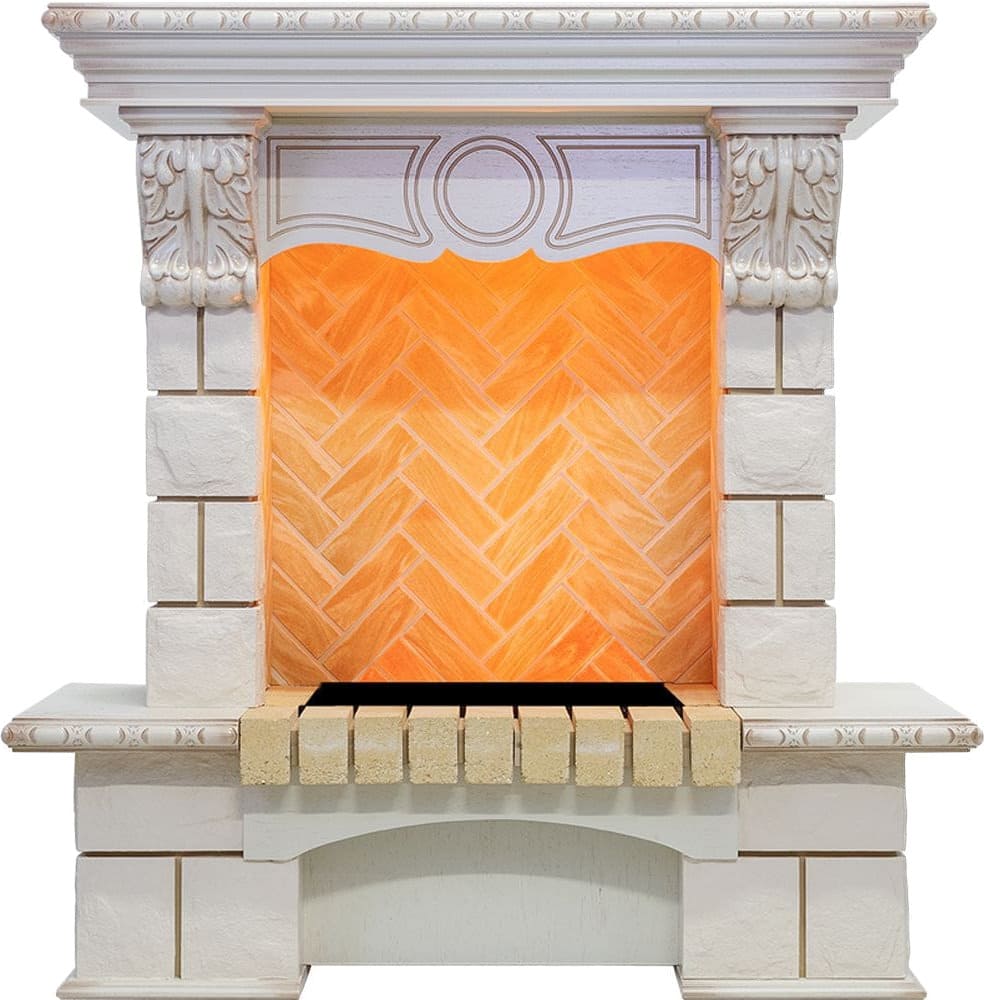 Портал имеет вытянутую конструкцию и возвышается на высоком пьедестале, декорированном полированной полкой. Боковые стойки украшены резными кронштейнами, а зона над очагом — фигурной планкой с элегантным орнаментом. Внизу очага находится аркообразная ниша, в которой можно разместить поленья. Сверху изделие оснащено широкой каминной полкой.
