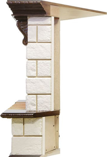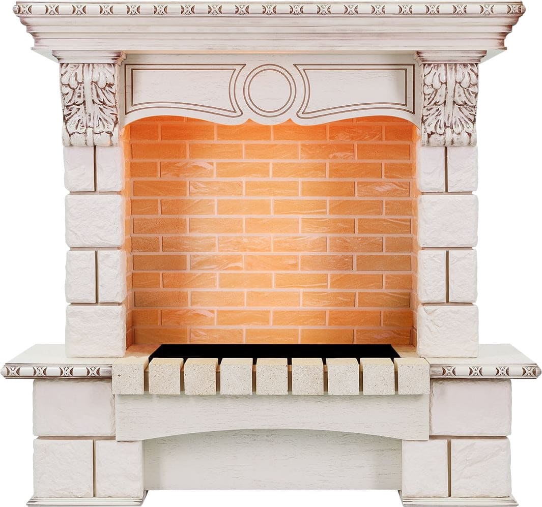 Портал имеет вытянутую конструкцию и возвышается на высоком пьедестале, декорированном полированной полкой. Боковые стойки украшены резными кронштейнами, а зона над очагом — фигурной планкой с элегантным орнаментом. Внизу очага находится аркообразная ниша, в которой можно разместить поленья. Сверху изделие оснащено широкой каминной полкой.