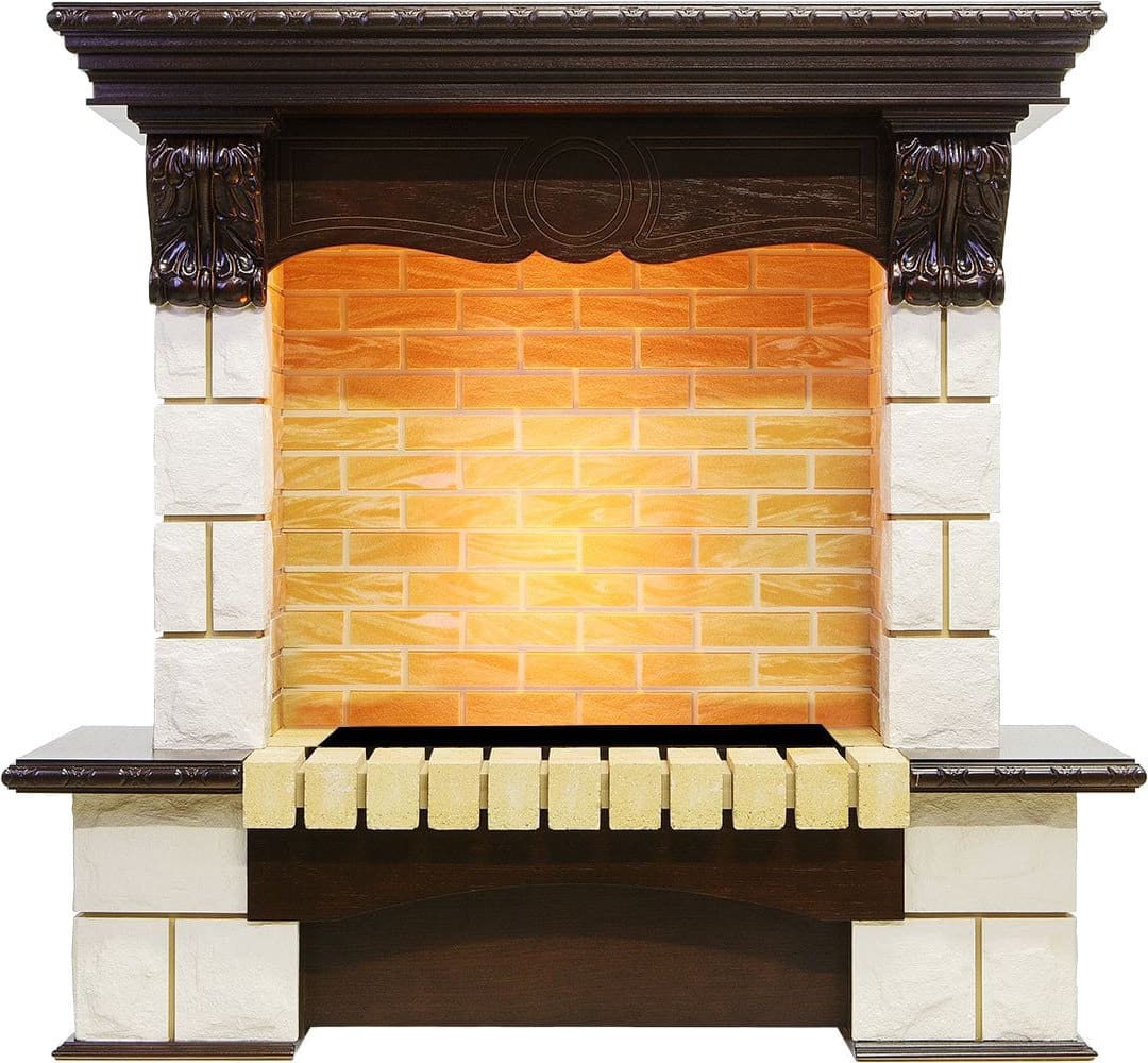 - При изготовлении порталов применяются плиты МДФ и высококачественный шпон в различных цветовых решениях: слоновая кость, белый дуб, темный орех, венге и так далее. Также встречается эмалевое покрытие, обеспечивающее прочность и водостойкость материала, или лаковое — сохраняющее текстуру дерева. При создании более дорогих моделей используют природный камень, фактура и цвет которых сочетаются с любым очагом.