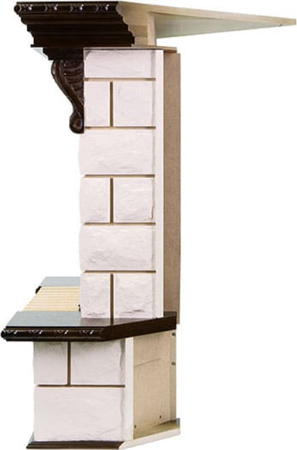 Портал имеет вытянутую конструкцию и возвышается на высоком пьедестале, декорированном полированной полкой. Боковые стойки украшены резными кронштейнами, а зона над очагом — фигурной планкой с элегантным орнаментом. Внизу очага находится аркообразная ниша, в которой можно разместить поленья. Сверху изделие оснащено достаточно широкой каминной полкой.