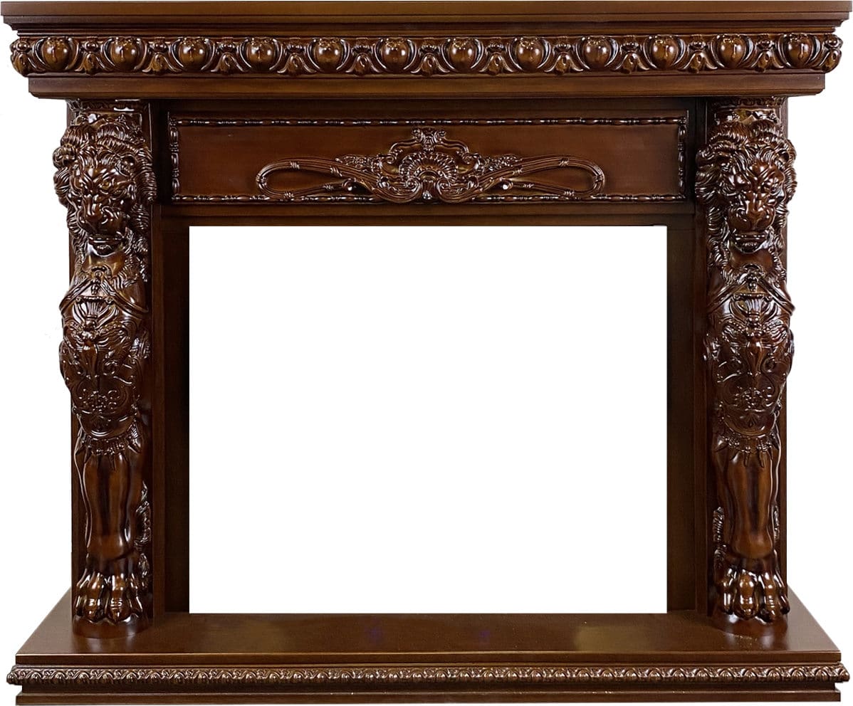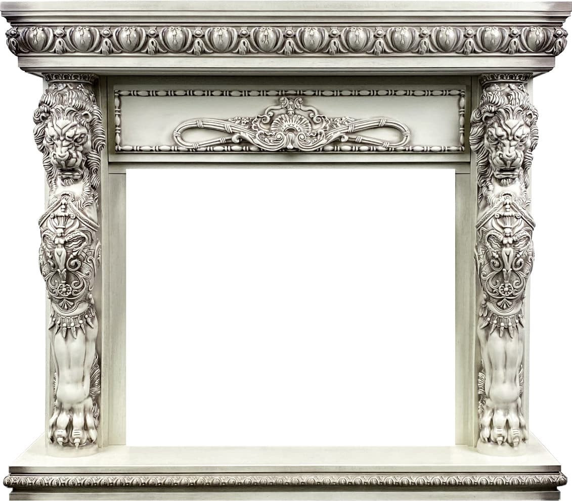 Колонны декорированы мифическими сюжетами, изображающими дев и массивные львиные фигуры, которые придают ему особую помпезность и богатый вид. Над зоной топки располагается витиеватый барельеф. Завершают композицию высокий подиум и широкая каминная полка, украшенная резным узором.