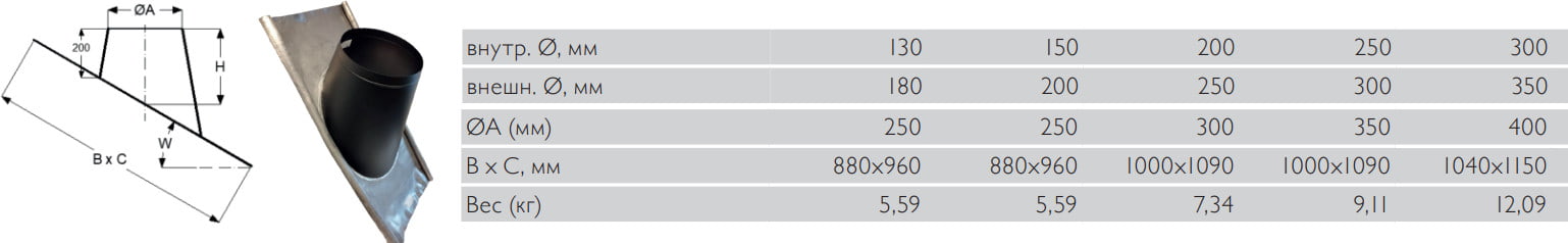 Деталь с наклоном от 3 до 15° обеспечивает герметичное примыкание кровли и конструкции дымоходного канала, препятствуя попаданию под них влаги. Используется с уплотнительной манжетой.