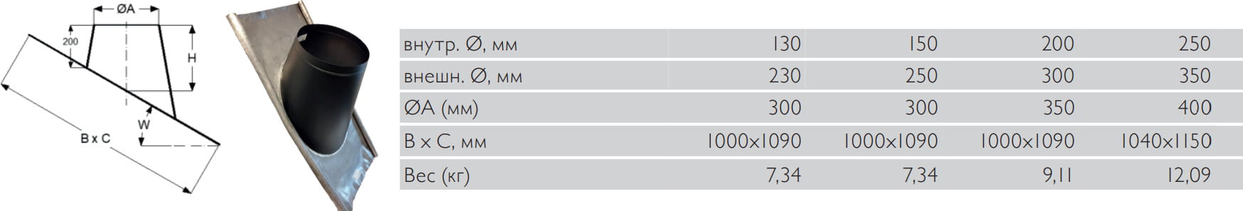 Деталь с наклоном от 3 до 15° обеспечивает герметичное примыкание кровли и конструкции дымоходного канала, препятствуя попаданию под них влаги. Используется с уплотнительной манжетой.