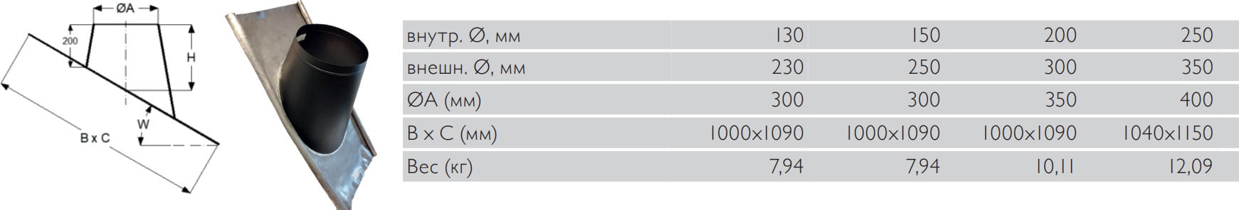 Деталь с наклоном от 26 до 35° обеспечивает герметичное примыкание кровли и конструкции дымоходного канала, препятствуя попаданию под них влаги. Используется с уплотнительной манжетой.
