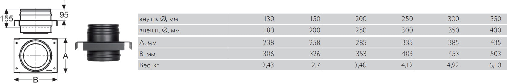 Используется в качестве промежуточной опоры при настенном способе крепления вертикальной конструкции дымоходного канала, обычно применяется в связке с емкостью для сбора конденсата. Монтаж детали требует наличие опорной консоли.