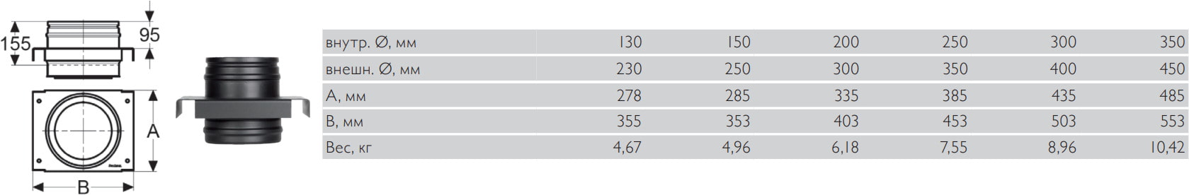 Используется в качестве промежуточной опоры при настенном способе крепления вертикальной конструкции дымоходного канала, обычно применяется в связке с емкостью для сбора конденсата. Монтаж детали требует наличие опорной консоли.