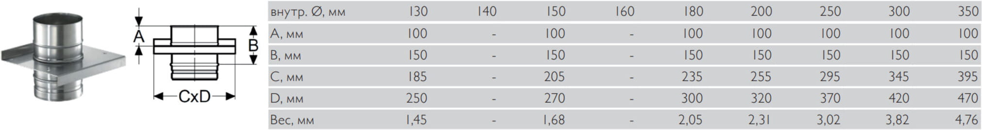 Используется в качестве промежуточной опоры при настенном способе крепления вертикальной конструкции дымоходного канала, обычно применяется в связке с заглушкой для твердого топлива для сбора и утилизации конденсата. Монтаж детали требует наличие опорной консоли.