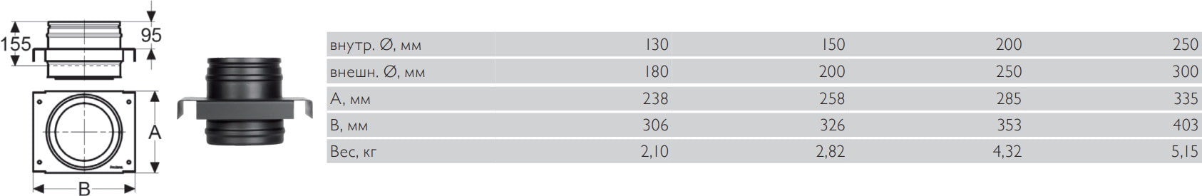 Используется в качестве промежуточной опоры при настенном способе крепления вертикальной конструкции дымоходного канала, обычно применяется в связке с емкостью для сбора конденсата. Монтаж детали требует наличие опорной консоли.