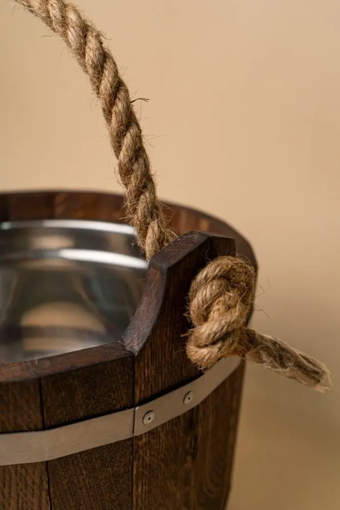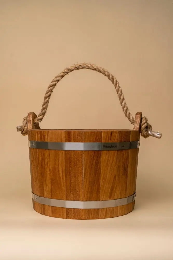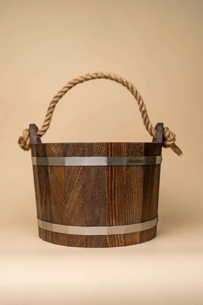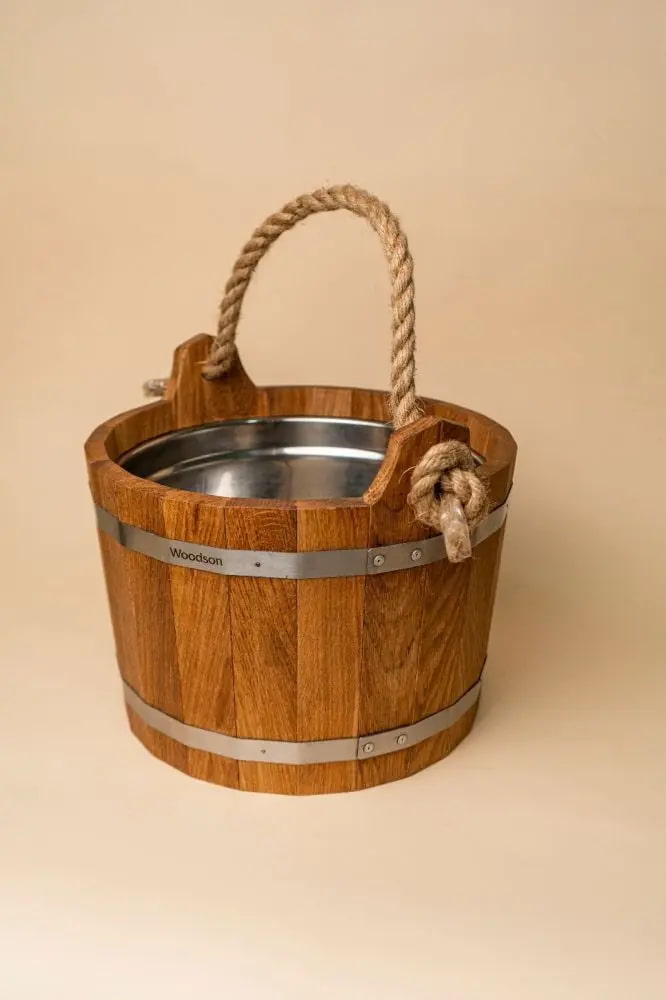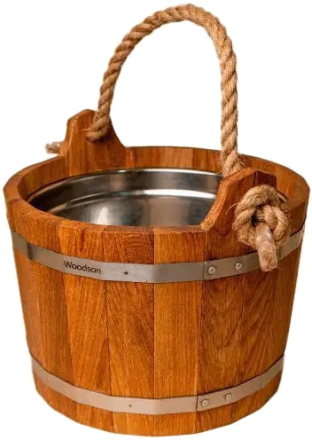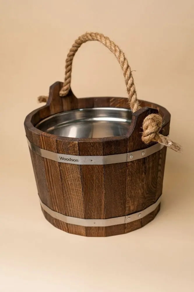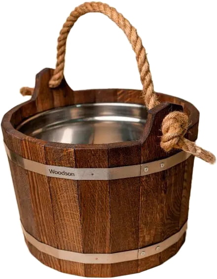 Шайка Woodson с нержавеющей вставкой, 10 л., Дуб (Шайка Вудсон с нержавеющей вставкой, 10 л., Дуб) — изделие, предназначенное для запаривания веников или трав, а также приготовления косметических смесей. Объём — 10 литров. Материалом изготовления выступает массив кавказского дуба светлого или тёмного оттенка. Всю окружность обрамляют два обжимных кольца из нержавеющей стали и клёпка толщиной 15 мм. Такое решение гарантирует сохранение формы шайки и её герметичность.