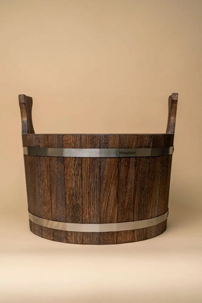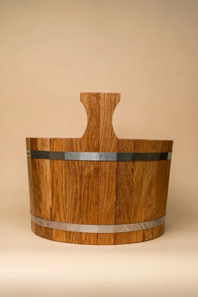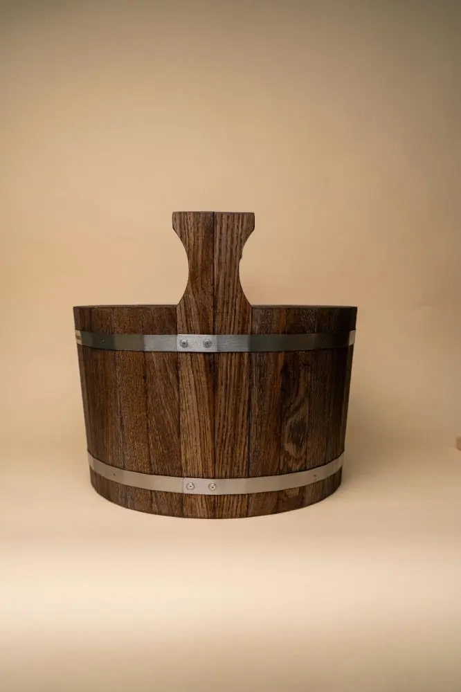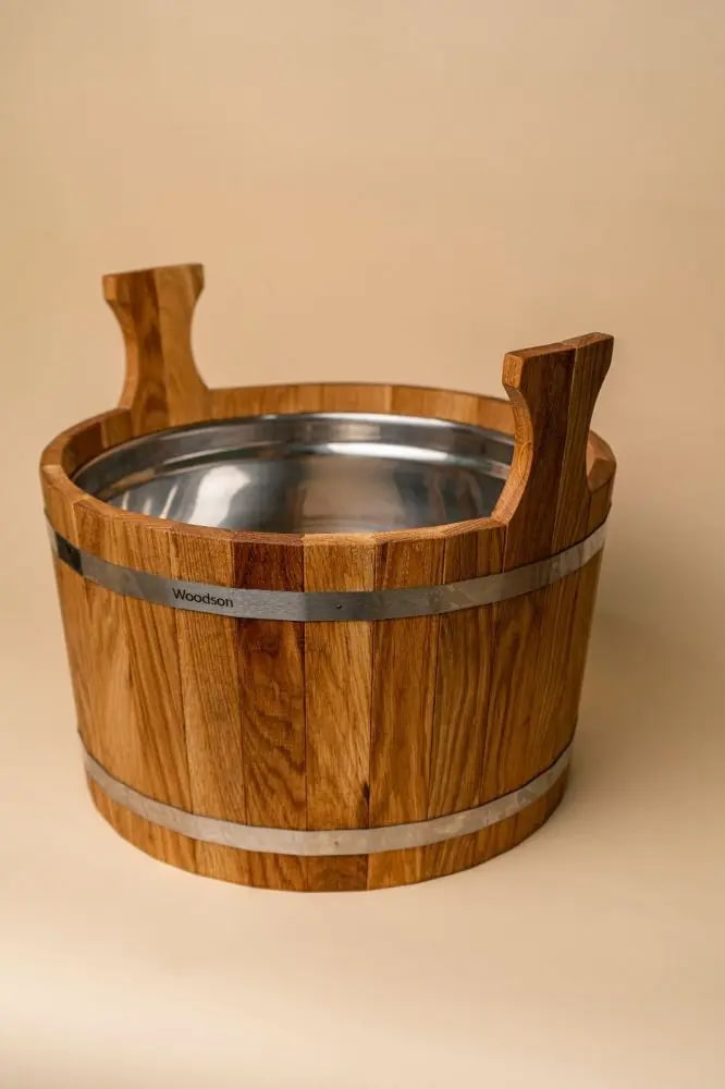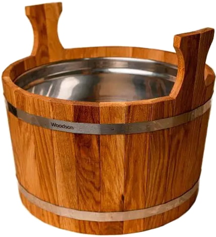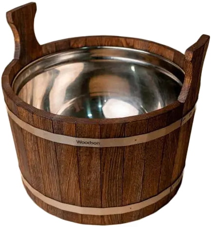 Шайка Woodson с нержавеющей вставкой, 17 л., Дуб (Шайка Вудсон с нержавеющей вставкой, 17 л., Дуб) — изделие, предназначенное для запаривания веников или трав, а также приготовления косметических смесей. Объём — 17 литров. Материалом изготовления выступает массив кавказского дуба светлого или тёмного оттенка. Всю окружность обрамляют два обжимных кольца из нержавеющей стали и клёпка толщиной 15 мм. Такое решение гарантирует сохранение формы шайки и её герметичность.