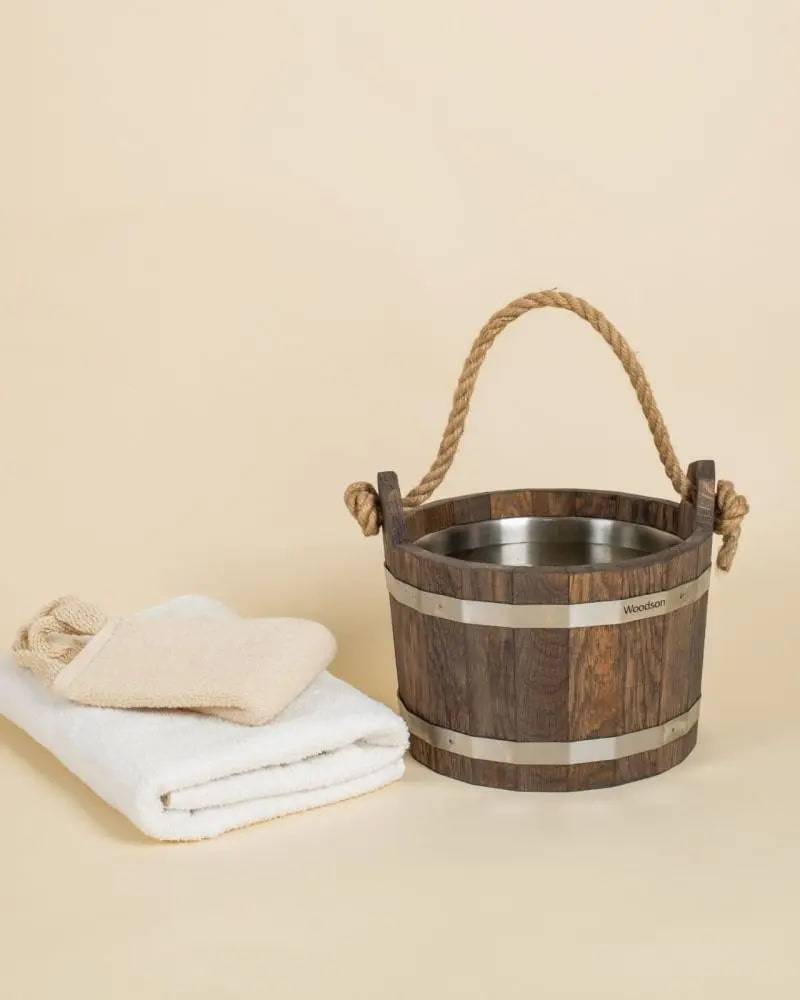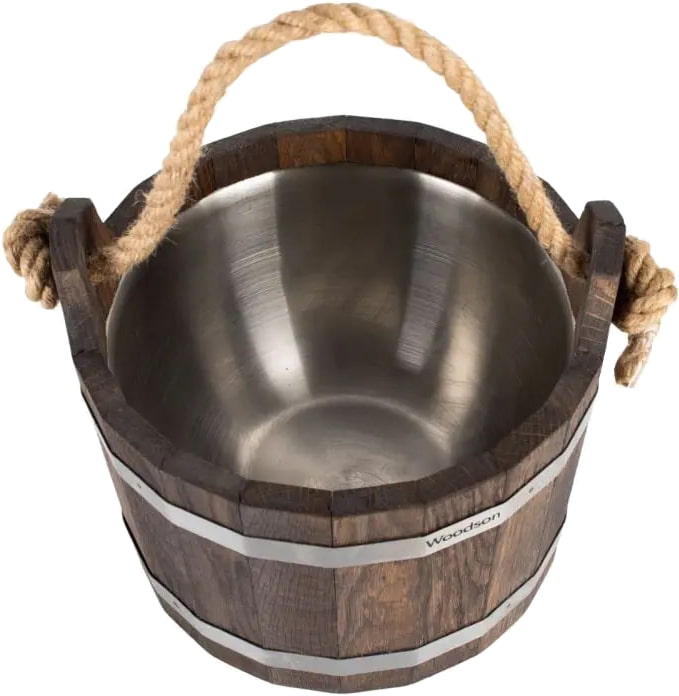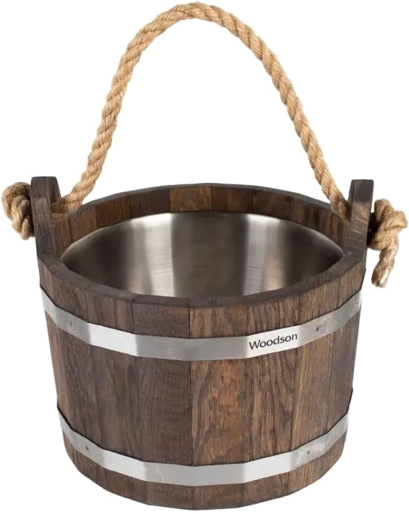 Шайка Woodson с нержавеющей вставкой, 4,5 л., Дуб (Шайка Вудсон с нержавеющей вставкой, 4,5 л., Дуб) — изделие, предназначенное для запаривания веников или трав, а также приготовления косметических смесей. Объём — 4,5 литра. Материалом изготовления выступает массив кавказского дуба светлого или тёмного оттенка. Всю окружность обрамляют два обжимных кольца из нержавеющей стали и клёпка толщиной 15 мм. Такое решение гарантирует сохранение формы шайки и её герметичность.