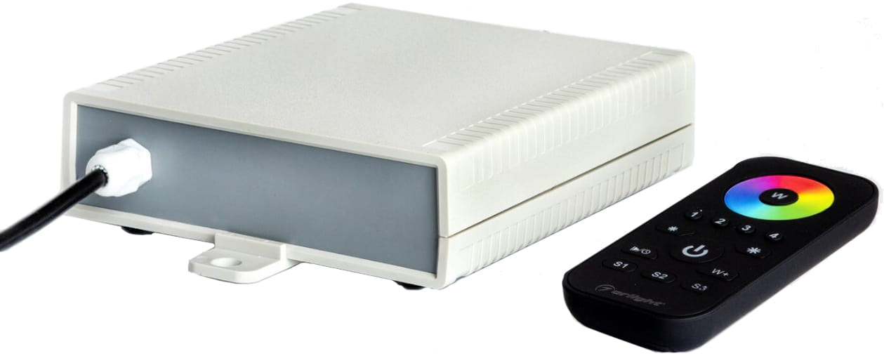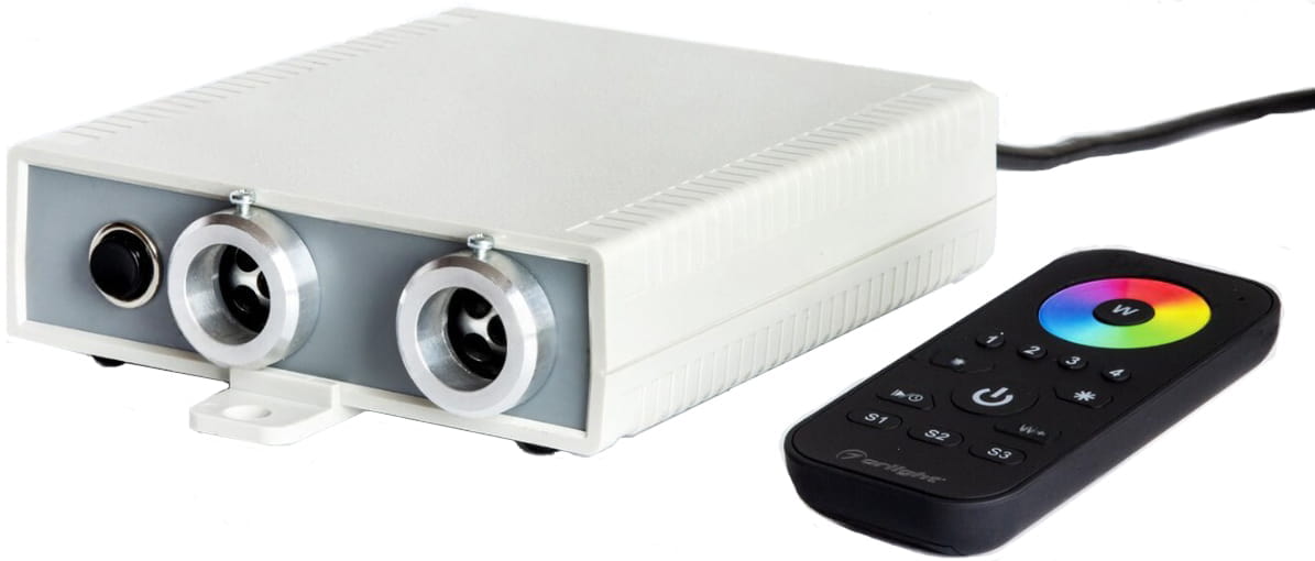 Mirage 1000 — Полноценный светодиодный проектор с дистанционным управлением и эффектом мерцания. Два выхода с эффектом мерцания и изменением цвета, возможно подключение двух жгутов по 500 волокон.
