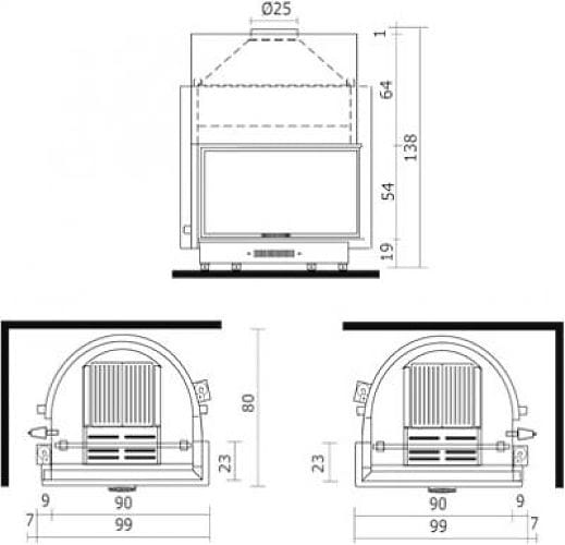 Топочная камера футерована огнеупорным кирпичом. На дне топки колосник с расположенным под ним зольным ящиком. Топка обладает всеми современными технологиями горения: вторичный дожиг газов и система "Чистое стекло". Очаг с возможностью притока воздуха извне. Для подключения необходим дымоход диаметром 250 мм.