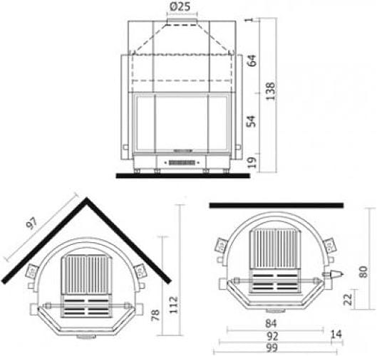 Топочная камера футерована огнеупорным кирпичом. На дне топки колосник с расположенным под ним зольным ящиком. Топка обладает всеми современными технологиями горения: вторичный дожиг газов и система "Чистое стекло". Очаг с возможностью притока воздуха извне. Для подключения необходим дымоход диаметром 250 мм.