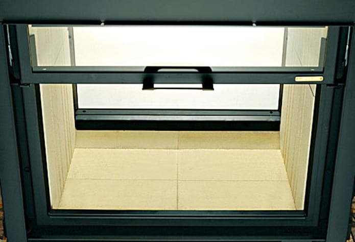 В топках используется термостойкое стекло, способное выдержать температуру до 800° C. Оно может быть прямым, призматическим или со сквозным обзором. Дверца оснащена подъёмным механизмом. Футеровкой топочной камеры выступает огнеупорный кирпич или чугун. В модельном ряду есть устройства, использующие как колосниковый, так и подовый тип горения.