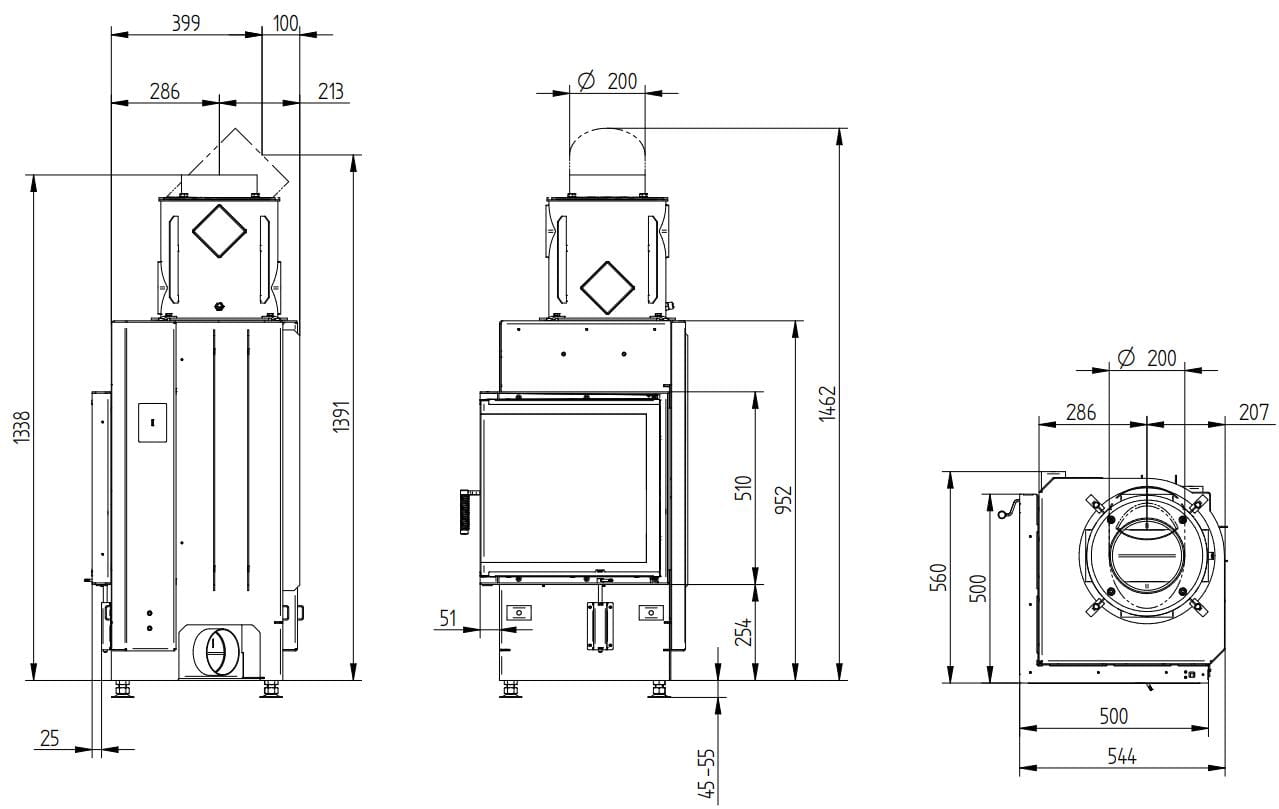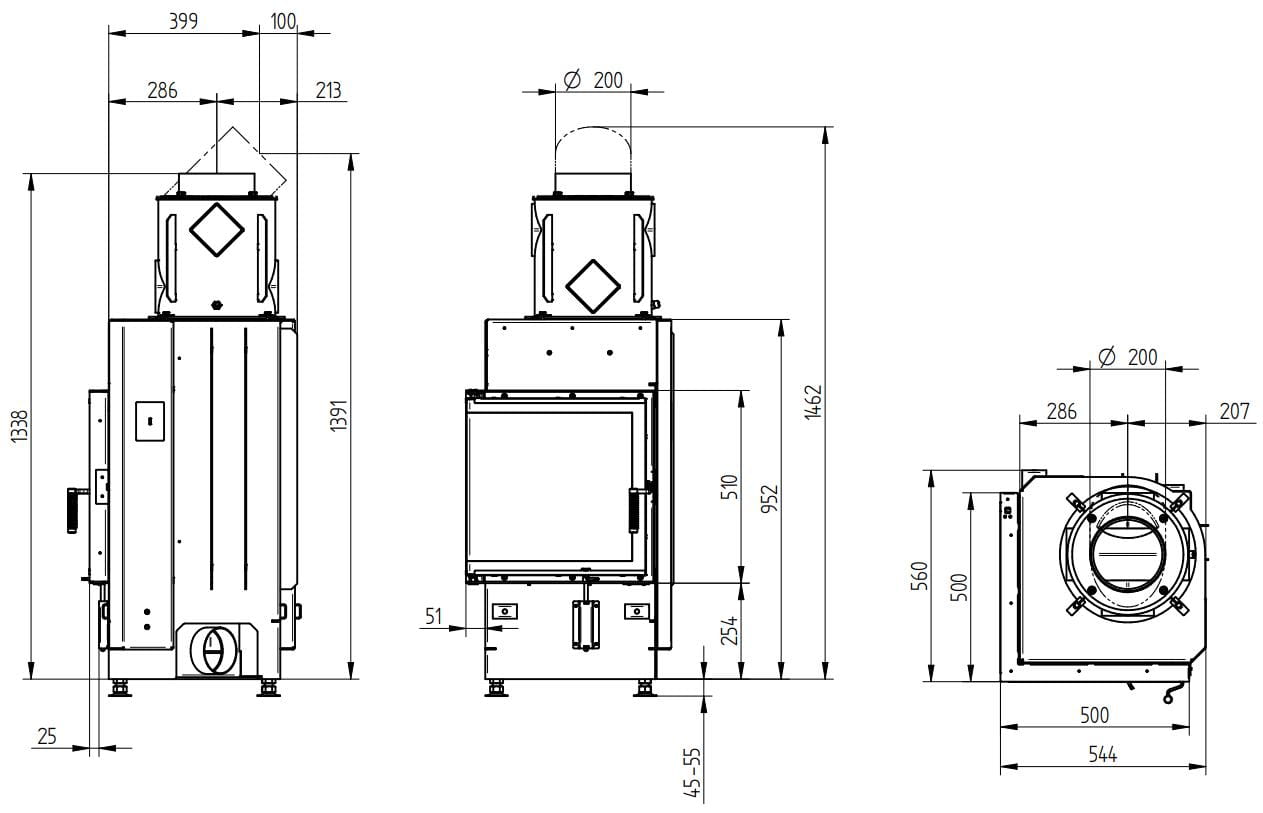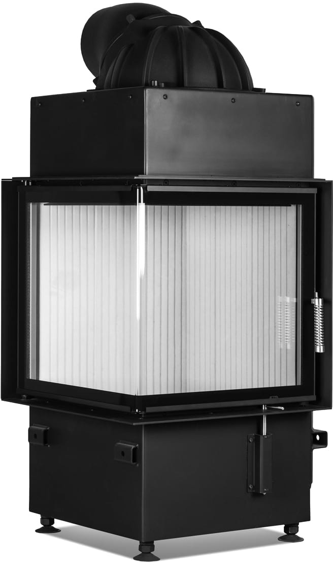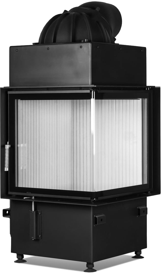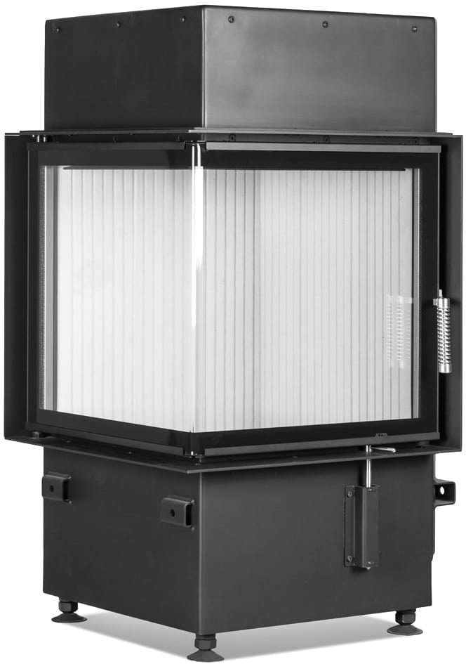КПД устройства > 80%. У топки угловое жаропрочное стекло, возможен вариант с двойным остеклением. Дверца с боковым открыванием влево или вправо. Ширина видимой части с каждой стороны — 500 мм, высота — 510 мм.
