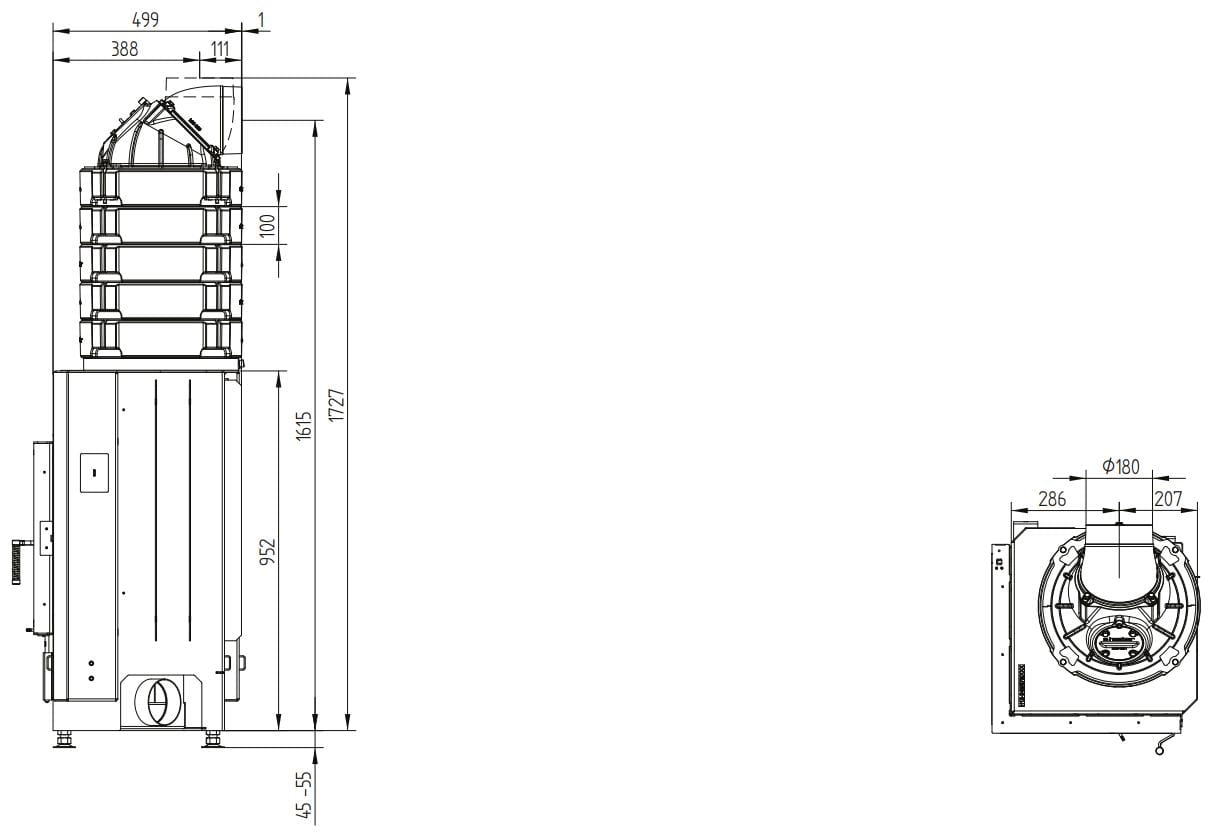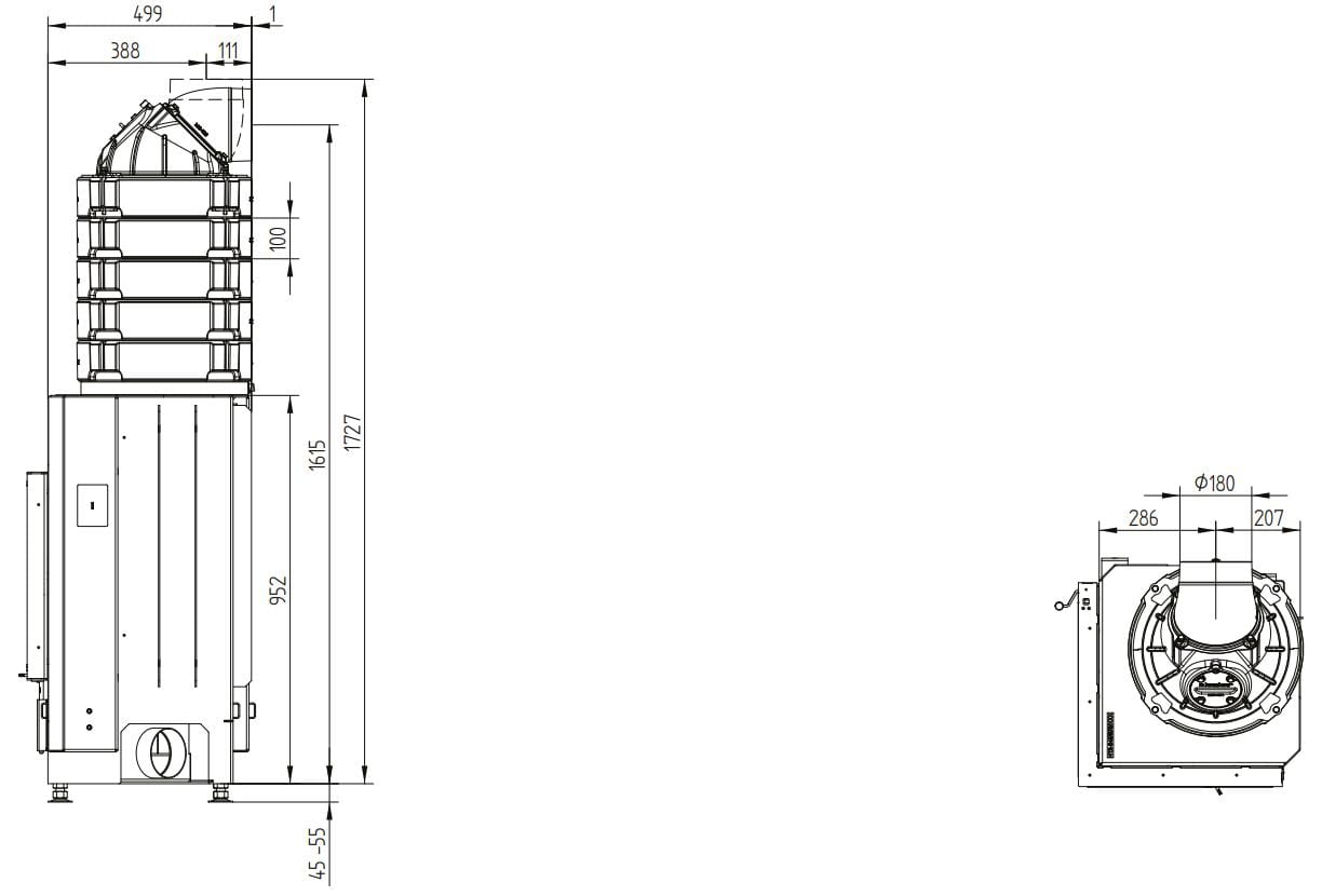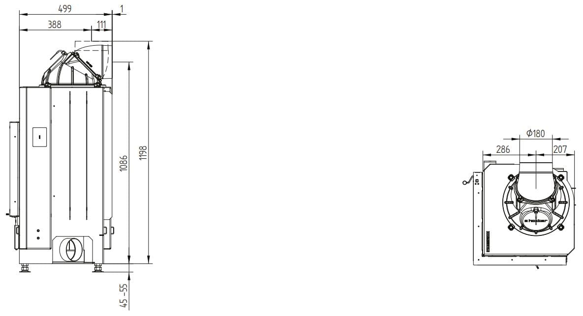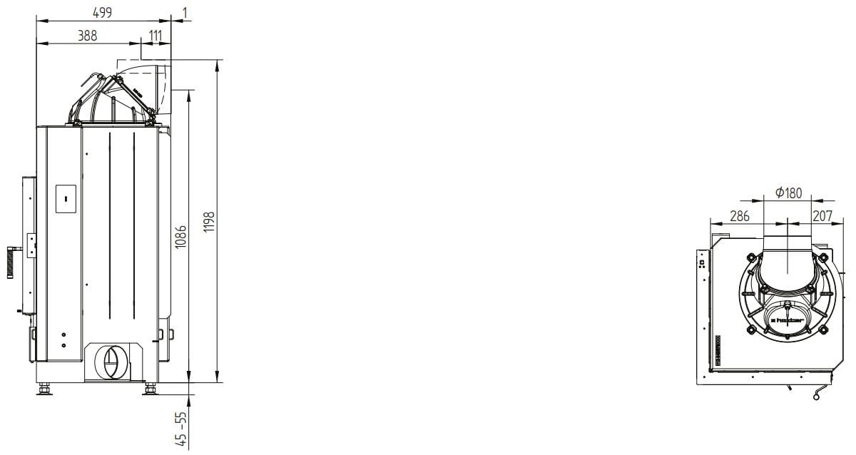 - Стальной теплообменник — дополнительный элемент в лаконичном дизайне, увеличивающий номинальную мощность до 10 кВт. Рекомендованный объём помещения — 250 м³. Возможен выход под 45 или 90°.