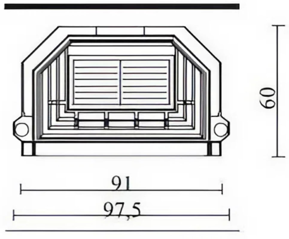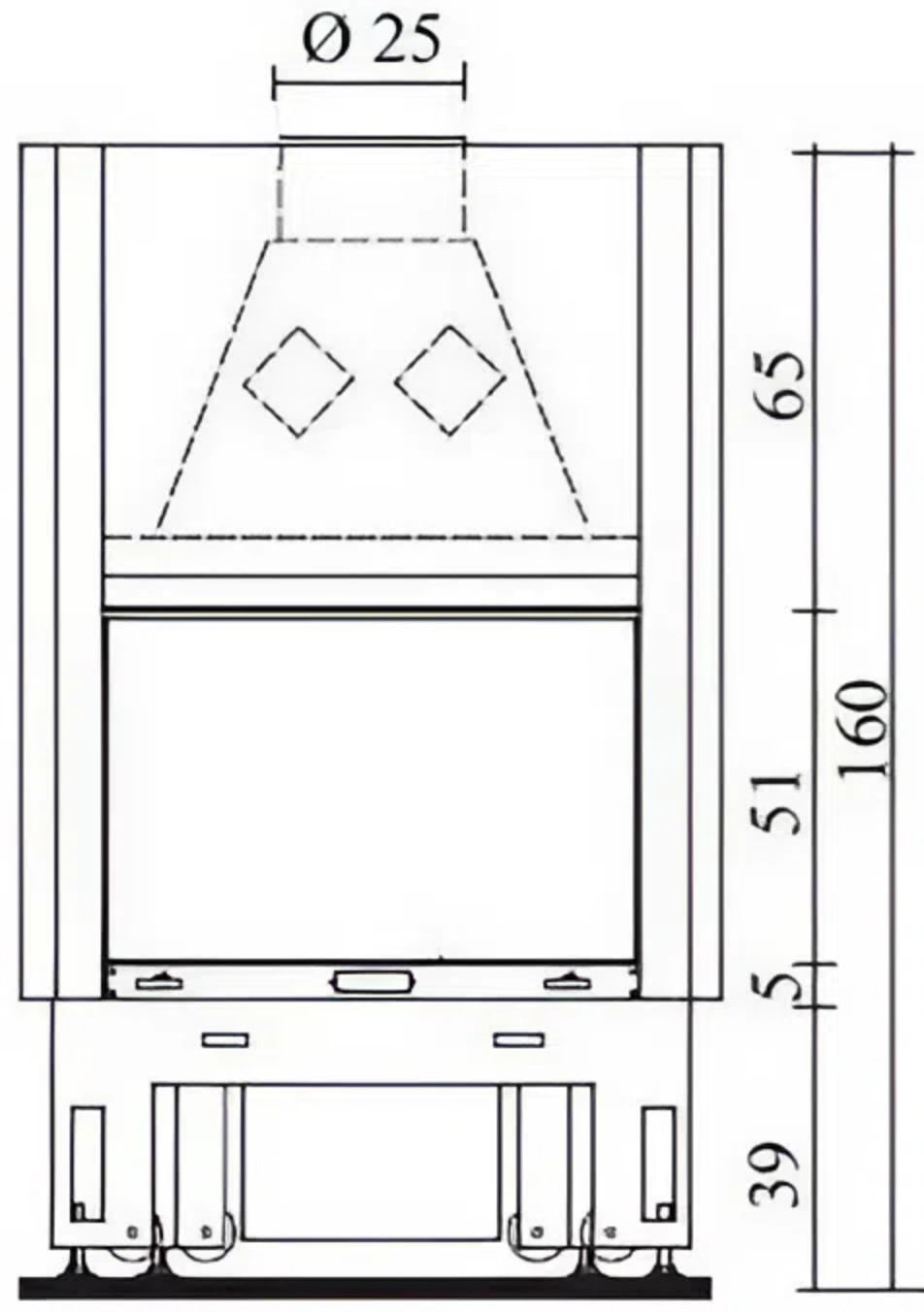 Топочная камера футерована чугуном. На дне топки колосник с расположенным под ним зольным ящиком. Модель обладает всеми современными технологиями горения: вторичный дожиг газов и система "Чистое стекло". Очаг с возможностью притока воздуха извне и распределения горячего воздуха по комнатам. Для отвода продуктов сгорания необходим дымоход диаметром 250 мм.