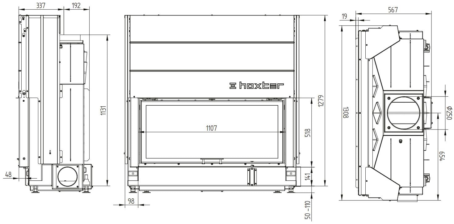 Также все модели Hoxter имеют возможность подвода воздуха на горение извне (из соседнего помещения или улицы). Для этого в конструкции предусмотрен патрубок диаметром 125 или 150 мм.