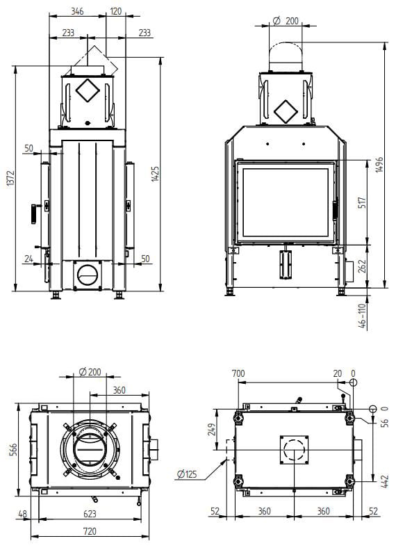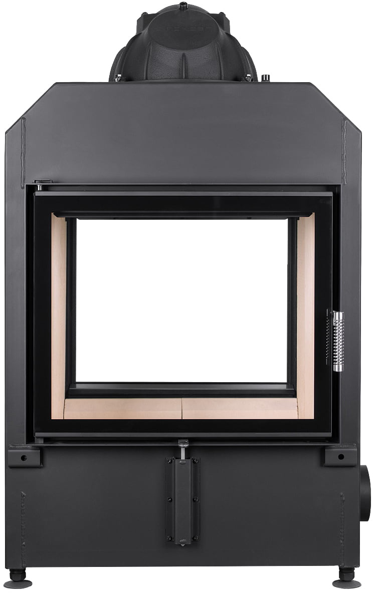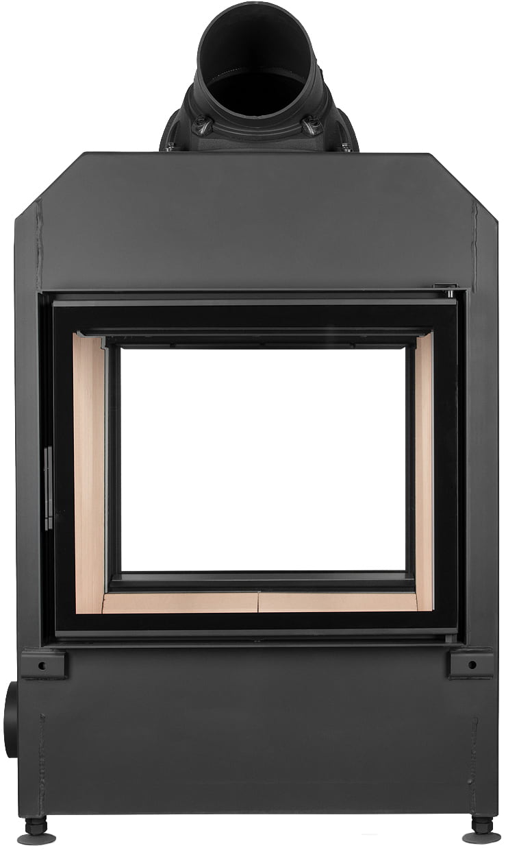 КПД > 80%. У топки два прямых жаропрочное стекла, образующих сквозной обзор. Возможен вариант с двойным остеклением. Обе дверцы с боковым открыванием. Ширина видимой части — 623 мм, высота — 517 мм.