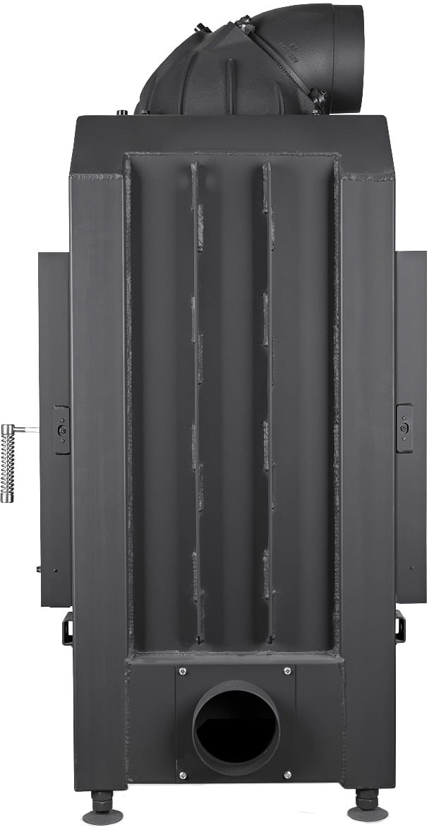 - Стальной теплообменник — дополнительный элемент в лаконичном дизайне, увеличивающий номинальную мощность до 13 кВт. Рекомендованный объём помещения — 325 м³. Возможен выход под 45 или 90°.