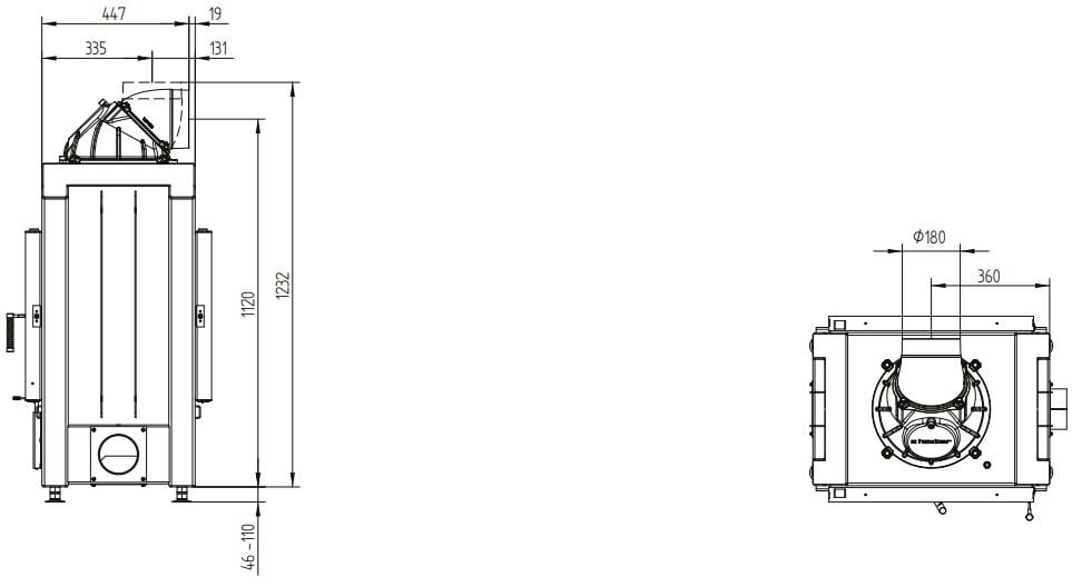 - Стальной теплообменник — дополнительный элемент в лаконичном дизайне, увеличивающий количество тепла, отдаваемого топкой благодаря продуманной циркуляции. Возможен вариант с выходом под 45 или 90°.
