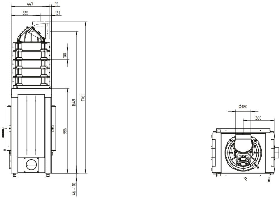 - Чугунный дымосборник — стандартная комплектация, обеспечивает классический конвекционный способ обогрева, когда холодный воздух поступает через нижние вент. решетки, нагревается и в виде тепла подаётся в помещение через верхние решетки. Это эффективный способ для того, чтобы быстро нагреть помещение, однако температура начинает падать, когда горение прекращается.