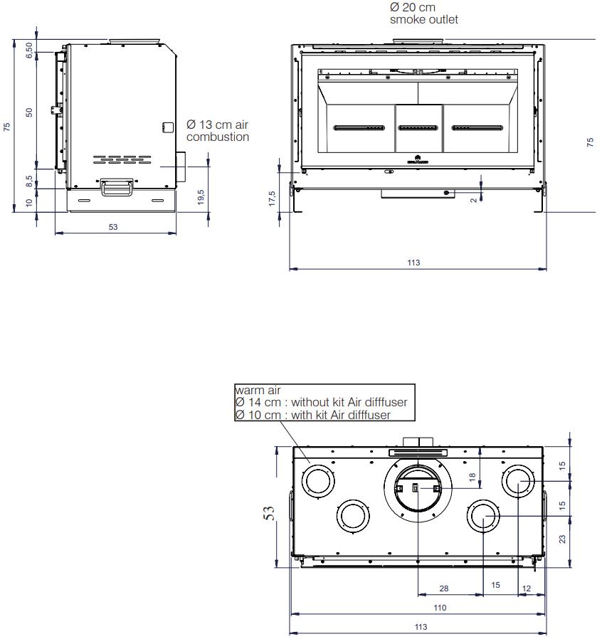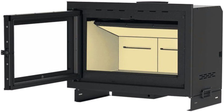 Топочная камера футерована огнеупорной керамикой Ecokeram. Топка с технологией подового (безколосникового) горения. Модель обладает всеми современными технологиями горения: вторичный дожиг газов и система "Чистое стекло". Очаг с возможностью притока воздуха извне и распределения горячего воздуха по комнатам. Для отвода продуктов сгорания необходим дымоход диаметром 200 мм.